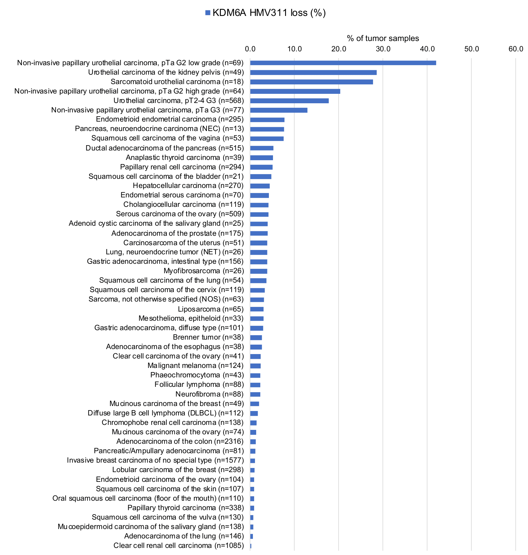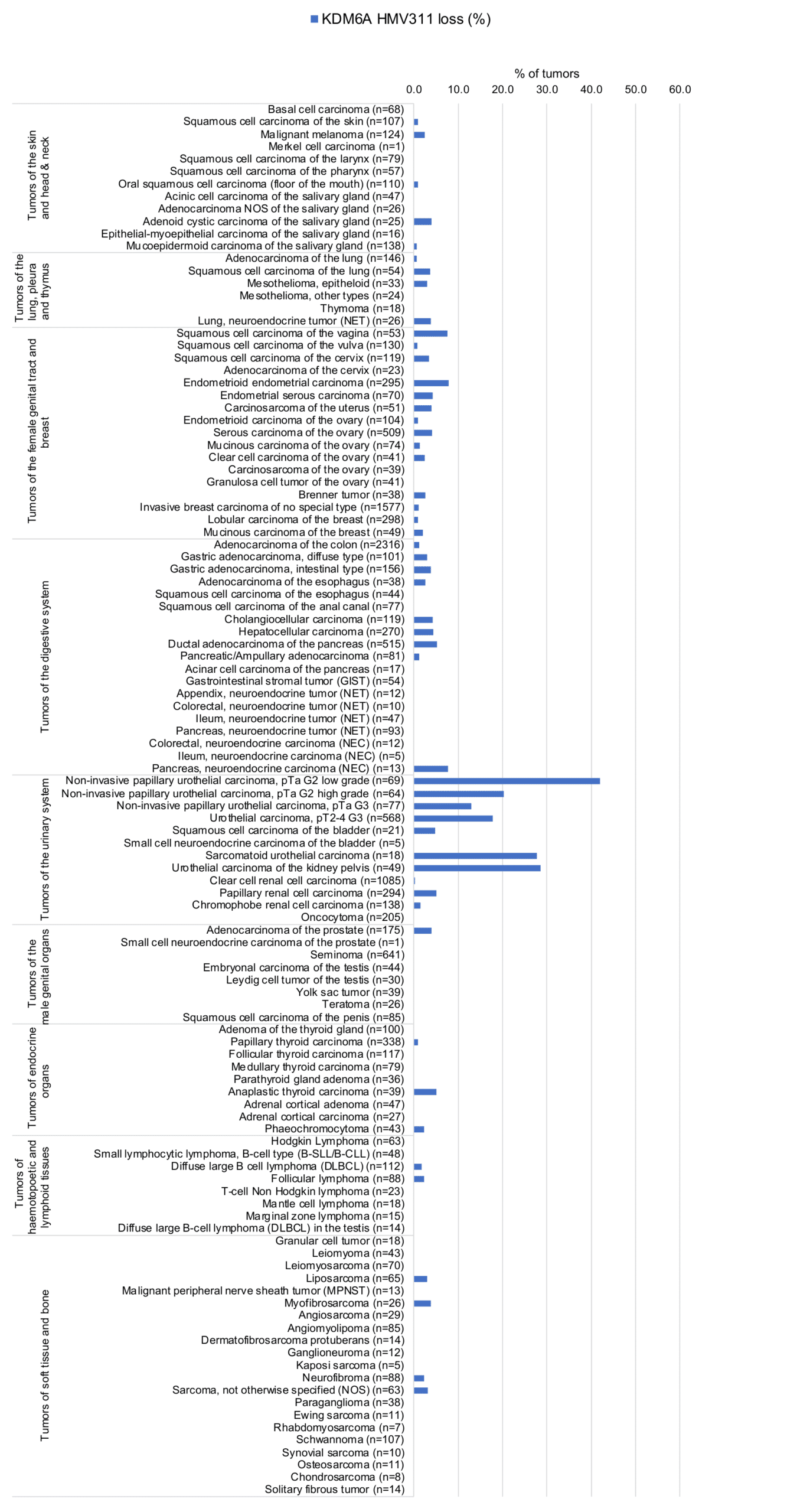 A KDM6A expression loss (indicating a truncating KDM6A mutation) primarily occurs in urothelial neoplasms but can also be seen in various other tumor entities. KDM6A expression at variable levels occurs in the vast majority of tumors.