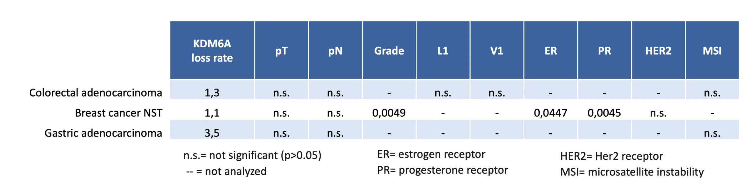 - A complete KDM6A loss (KDM6A deficiency) was associated with high grade (p=0.0049) as well as with ER and PR loss (p<0.05 each) in breast cancer of no special type in the present study (Viehweger et al.).