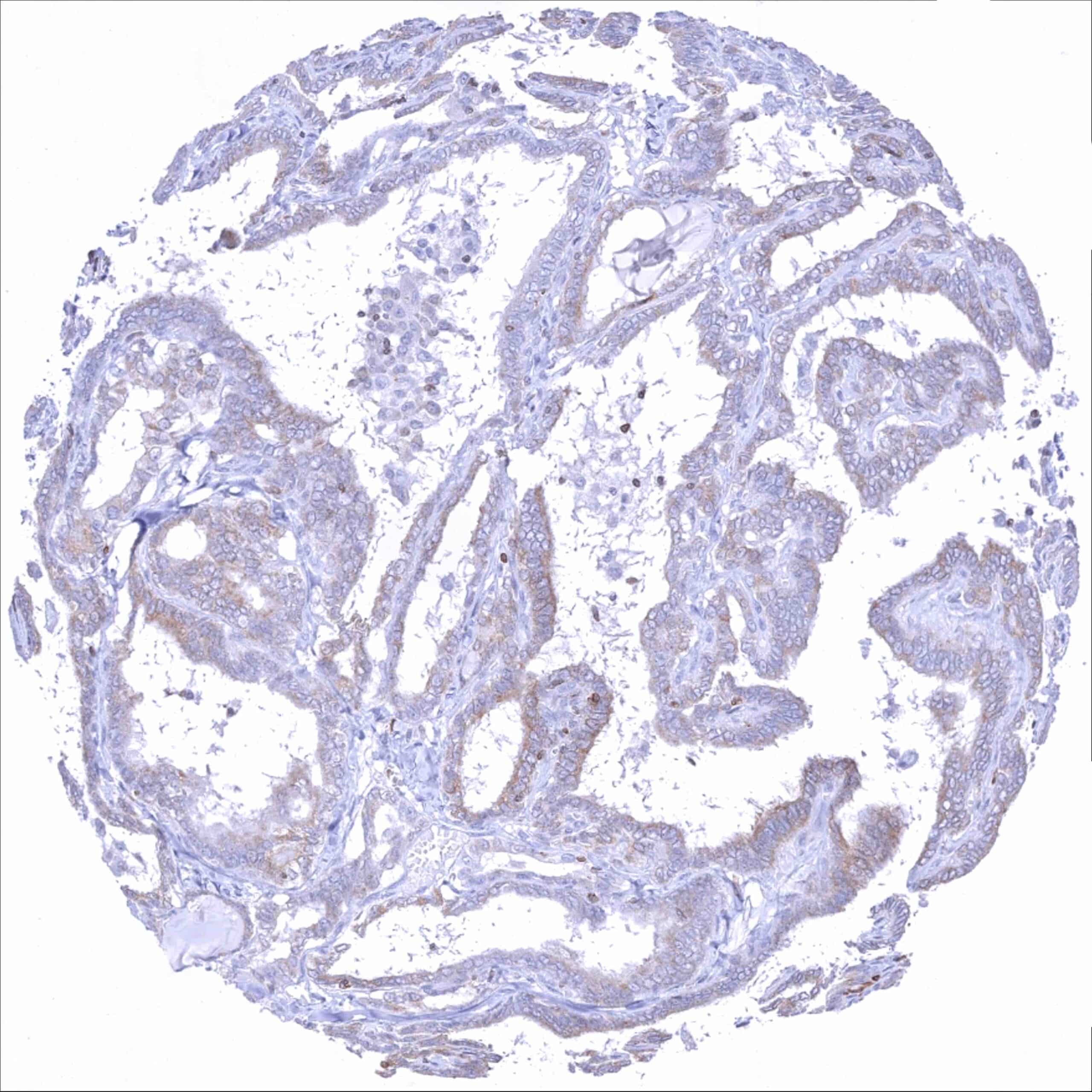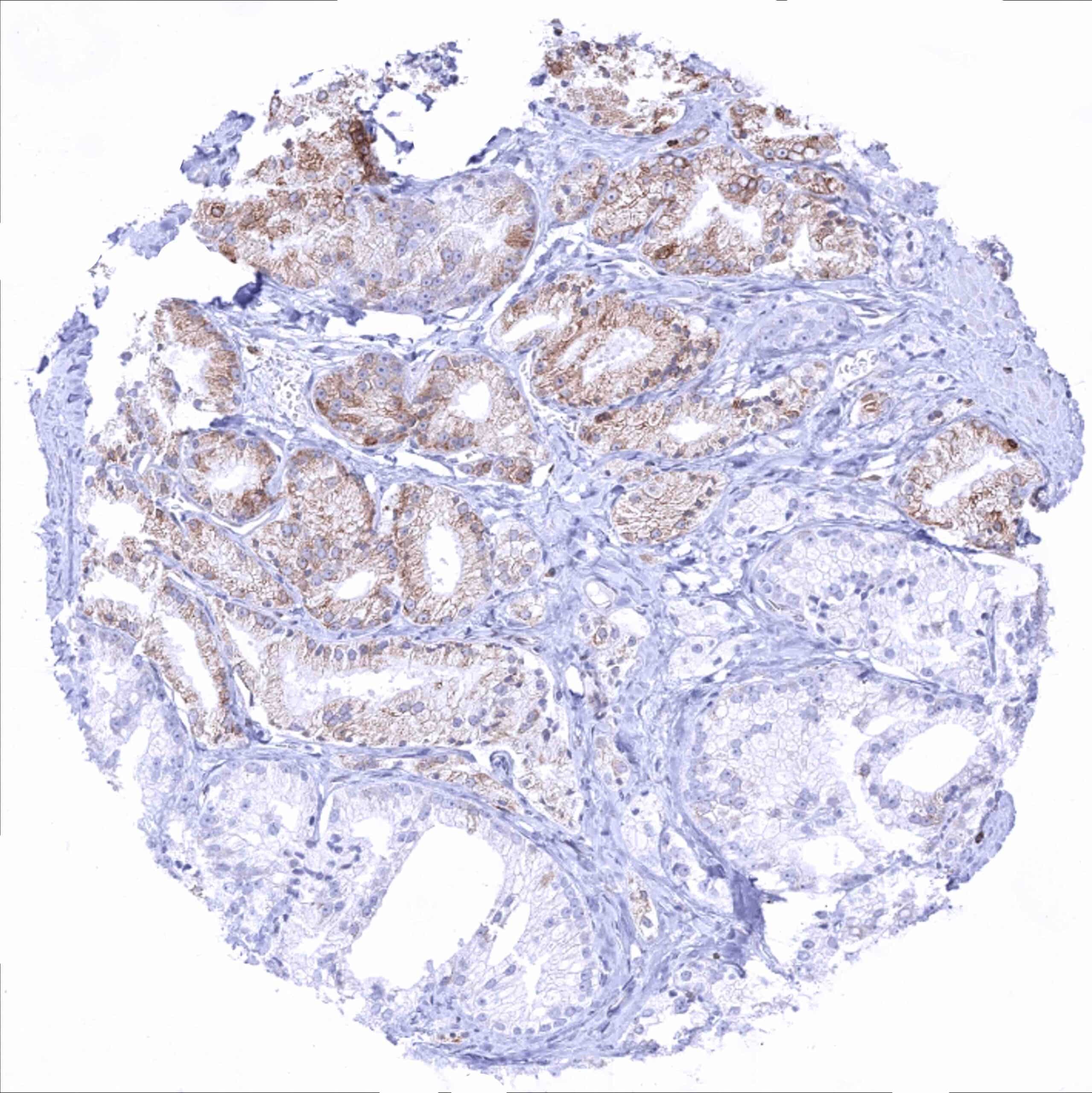 Prostate – Bcl-2 negative adenocarcinoma (Gleason 3+3=6). Tumor adjacent normal glands show a weak to moderate staining (most prominent in basal cells)_