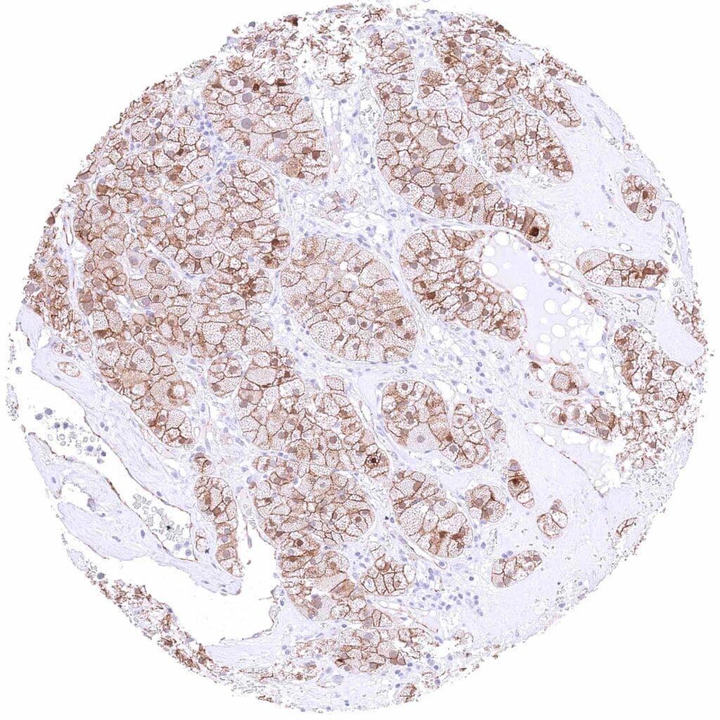 Adrenal gland – Adrenocortical adenoma with moderate membranous β-Catenin staining of tumor cells accompanied by a distinct nuclear staining of a subset of cells.