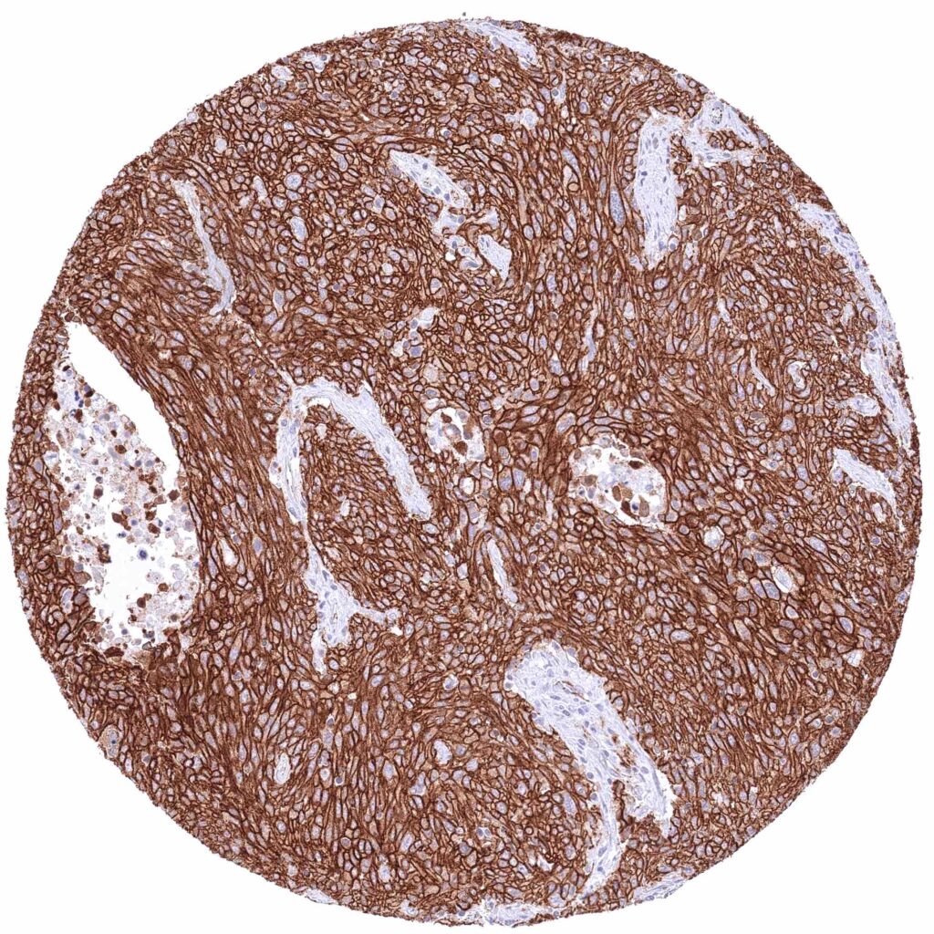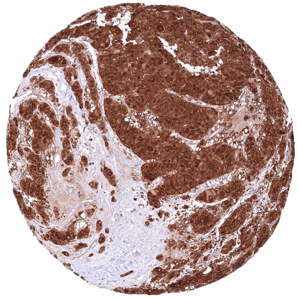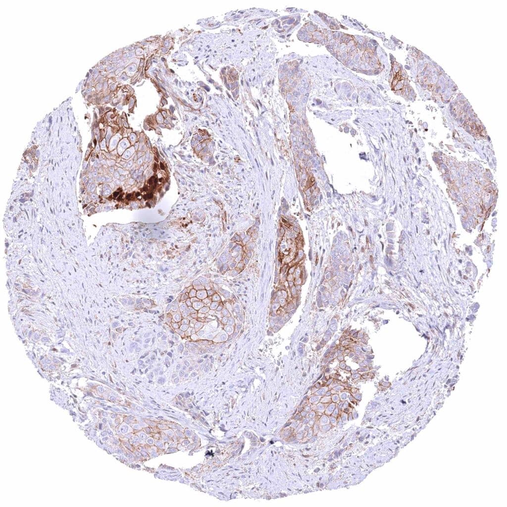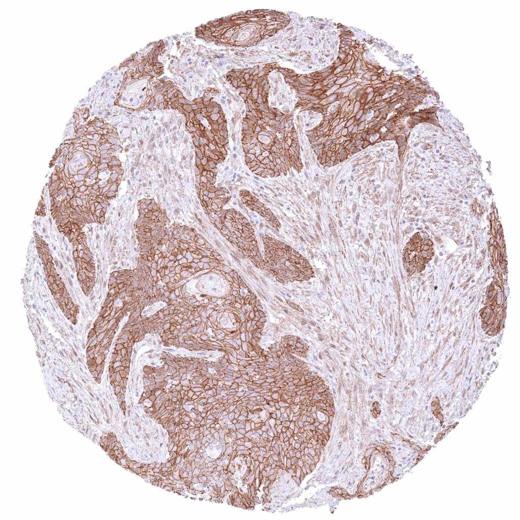 Uterus, cervix – Squamous cell carcinoma with strong membranous β-Catenin positivity of tumor cells.