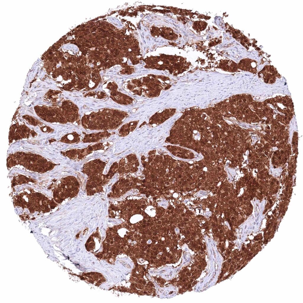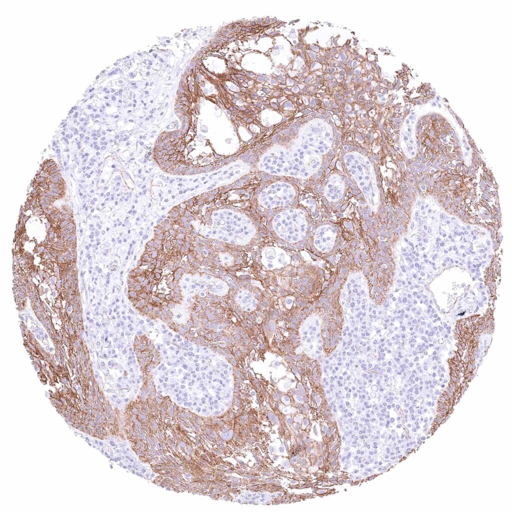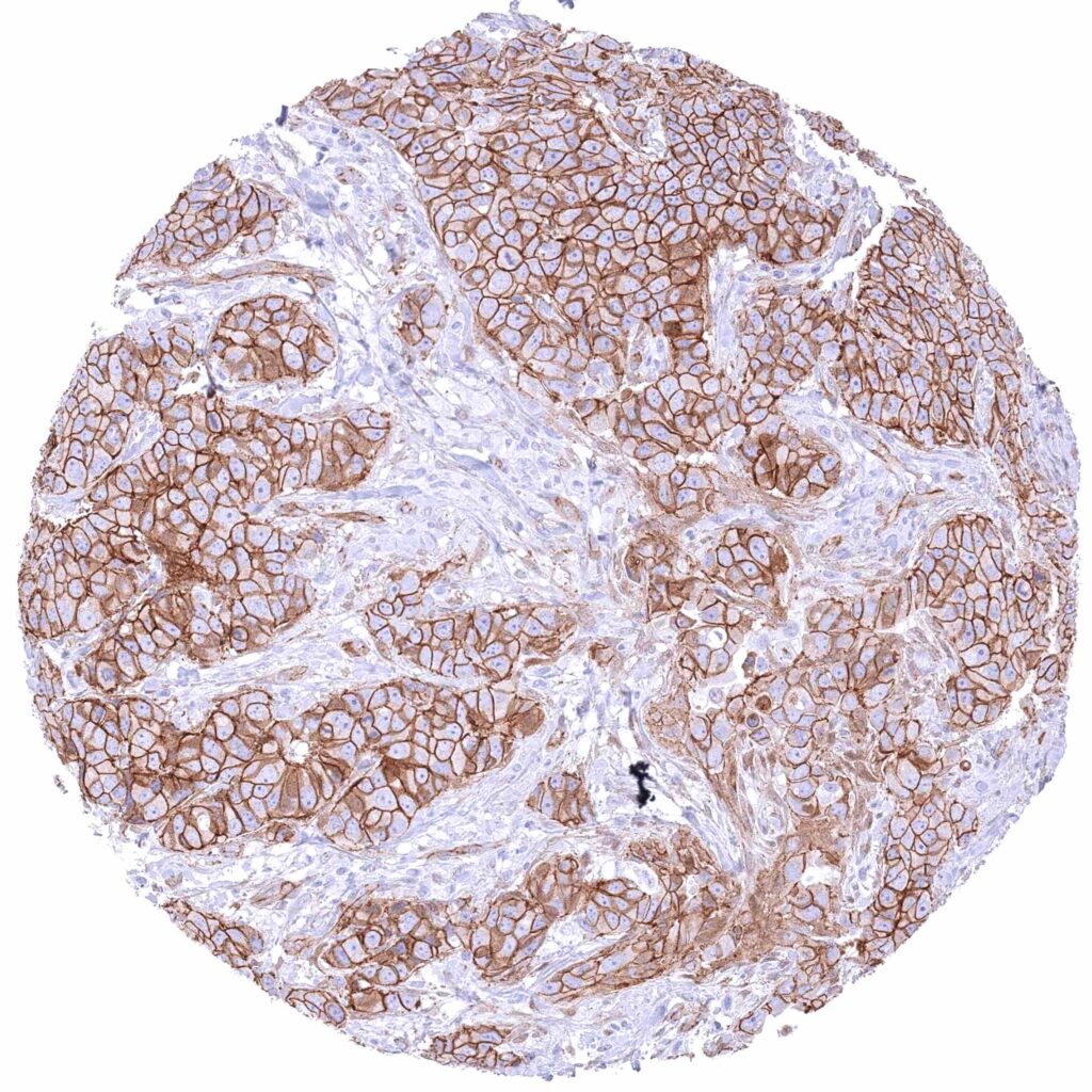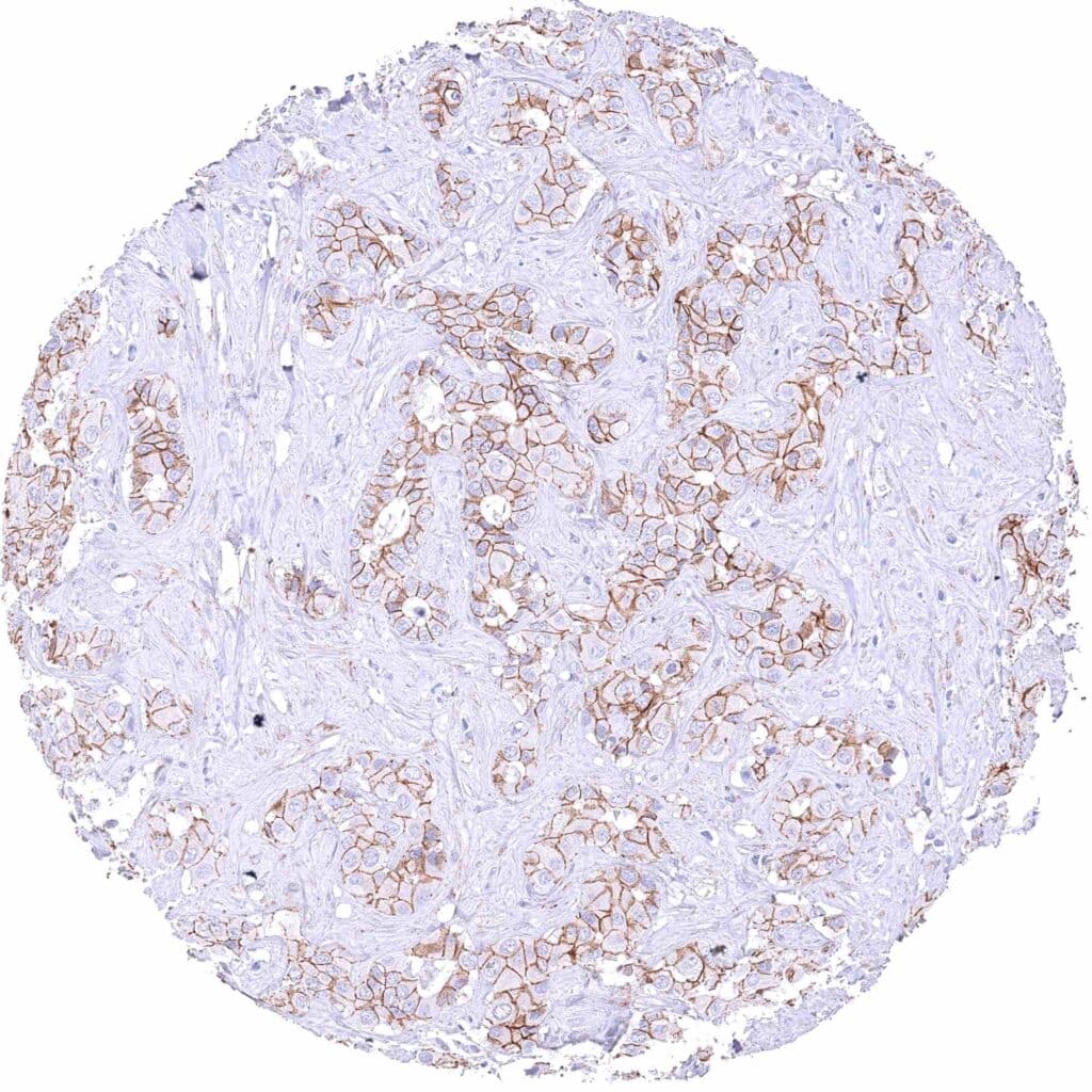 Breast – Invasive breast cancer of no special type (NST) with strong membranous β-Catenin staining of tumor cells.