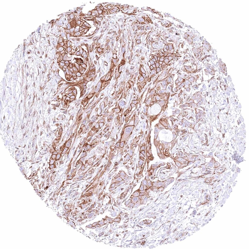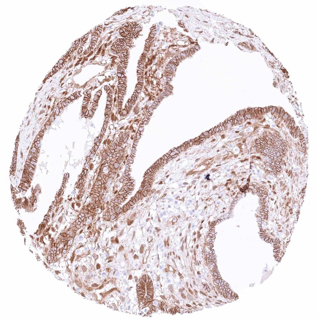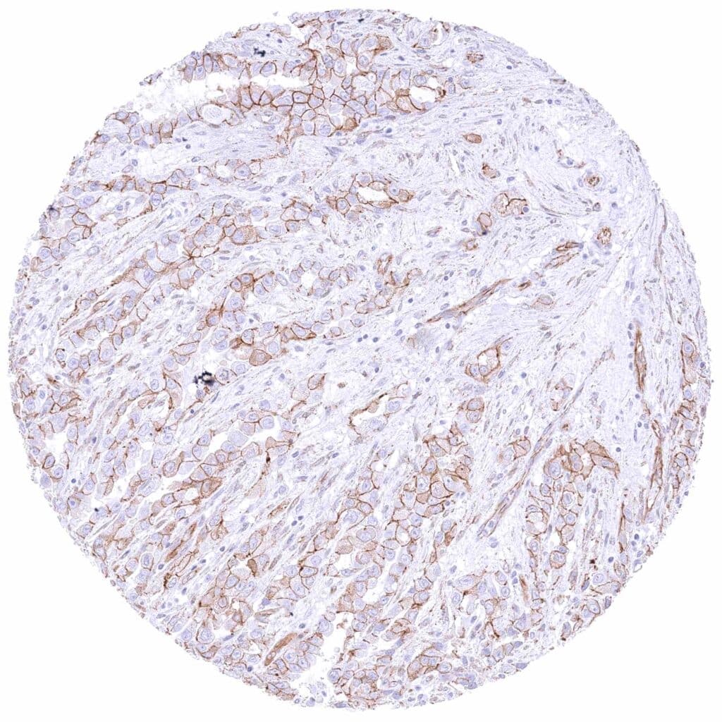 Pancreas – Ductal adenocarcinoma with strong membranous β-Catenin staining of tumor cells possibly accompanied by a mild cytoplasmic positivity.