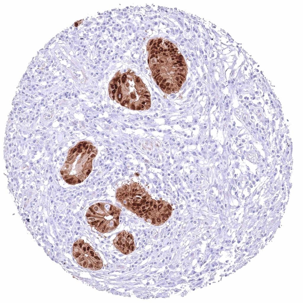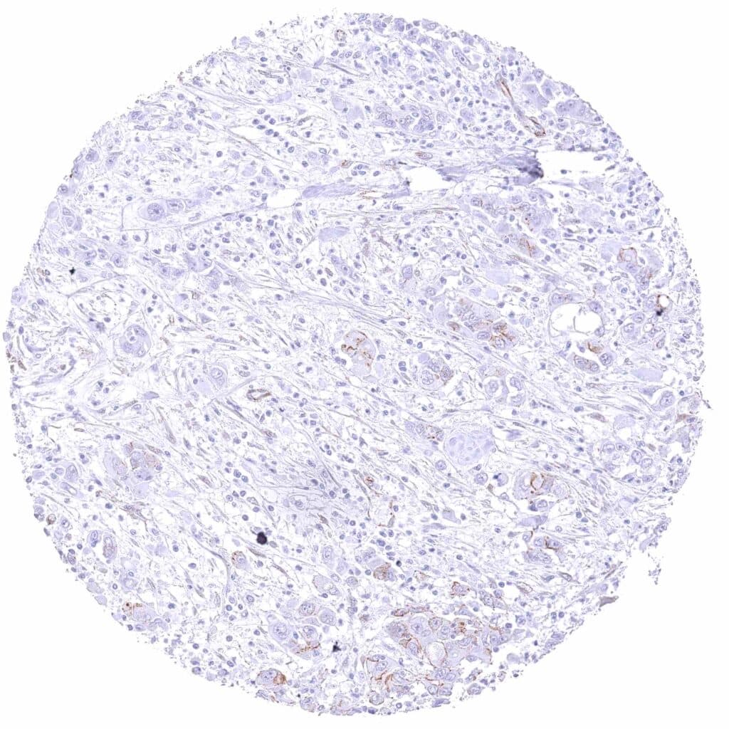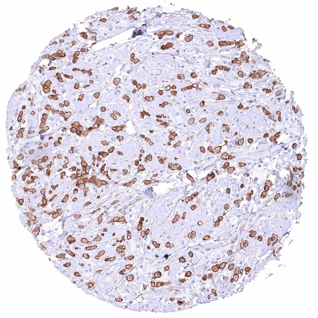 Pancreas – Ductal adenocarcinoma with strong membranous β-Catenin staining of tumor cells possibly accompanied by a mild cytoplasmic positivity.
