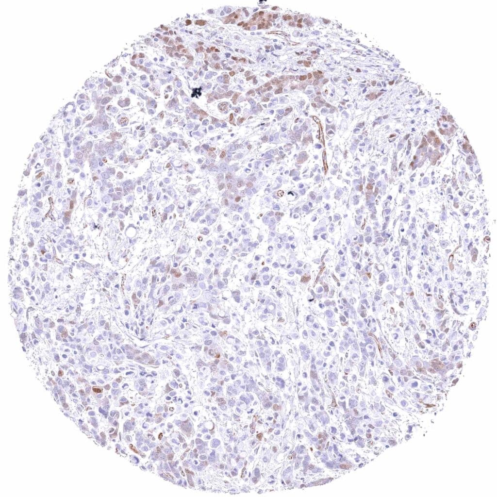 Esophagus – Adenocarcinoma with focal, weak to moderate nuclear and cytoplasmic β-Catenin staining of tumor cells.