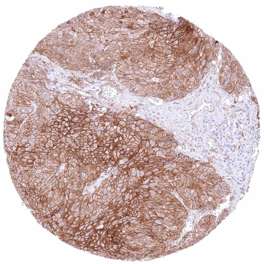 Penis – Squamous cell carcinoma with strong membranous β-Catenin staining of the peripheral tumor cell layers while other areas show a distinct nuclear and cytoplasmic positivity.