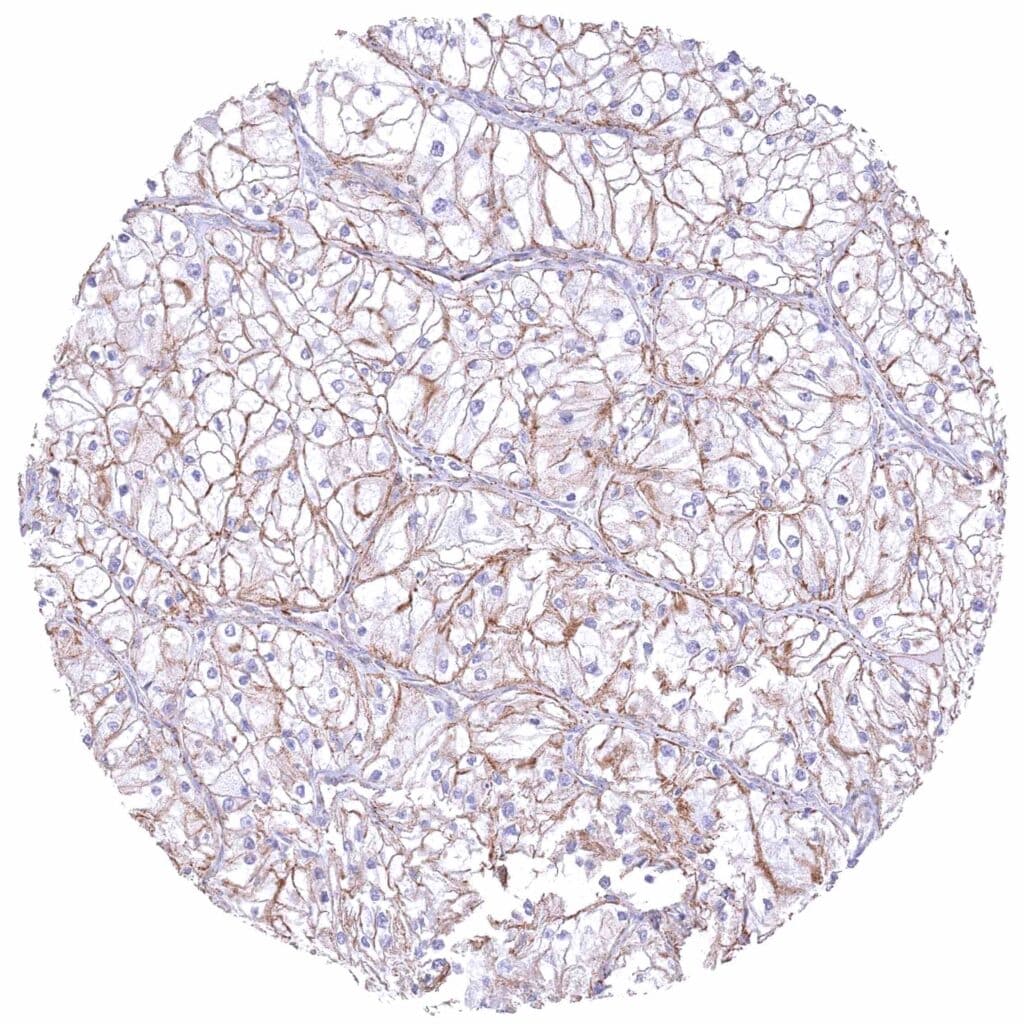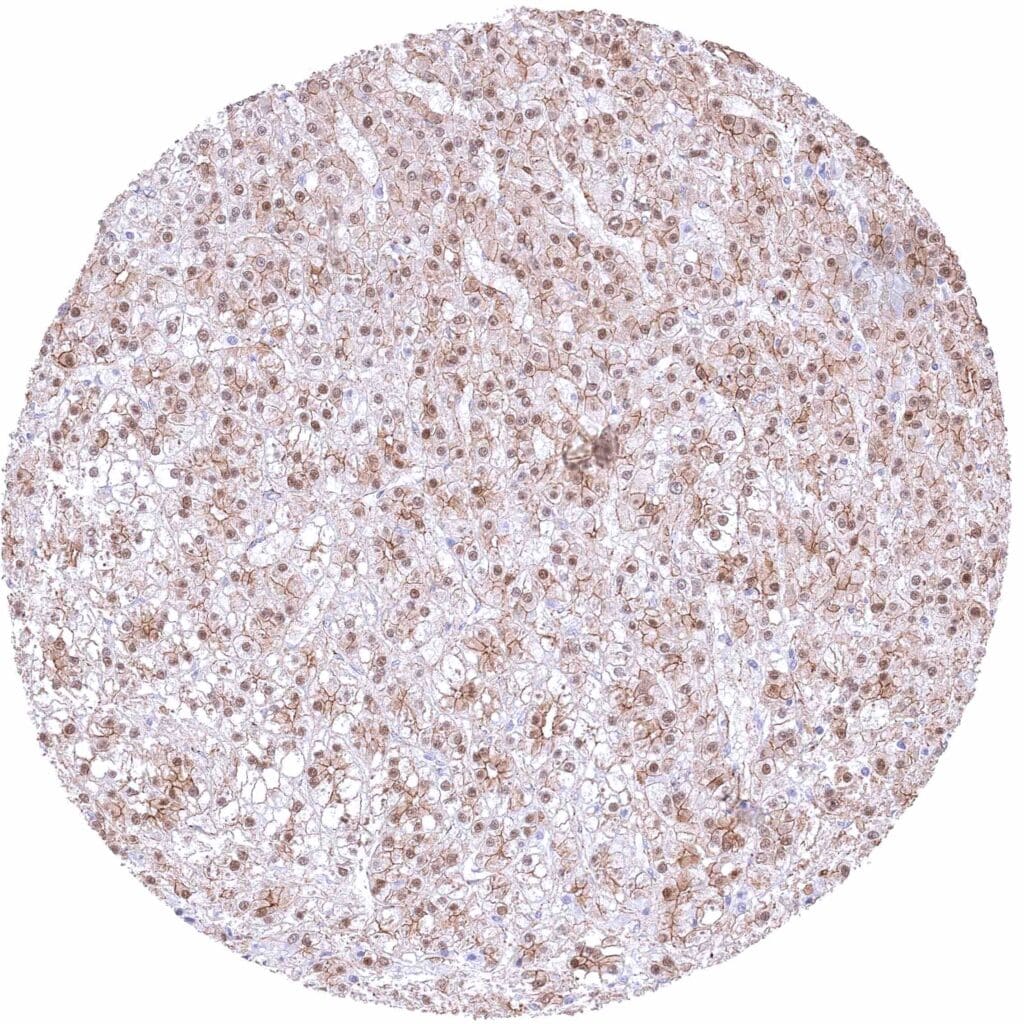 Kidney – Clear cell renal cell carcinoma with weak to moderate β-Catenin staining of tumor cells.