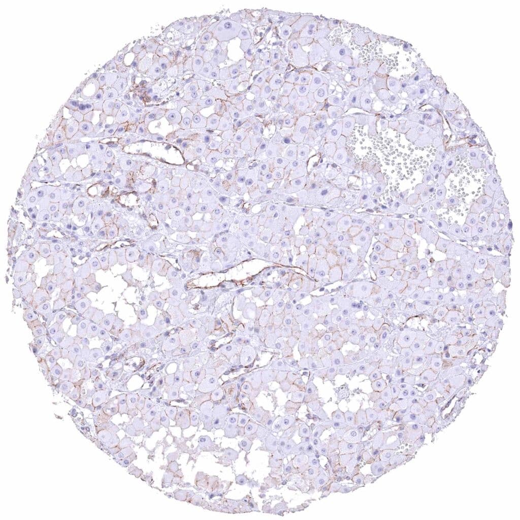 Kidney – Oncocytoma with only a faint membranous β-Catenin staining of tumor cells.