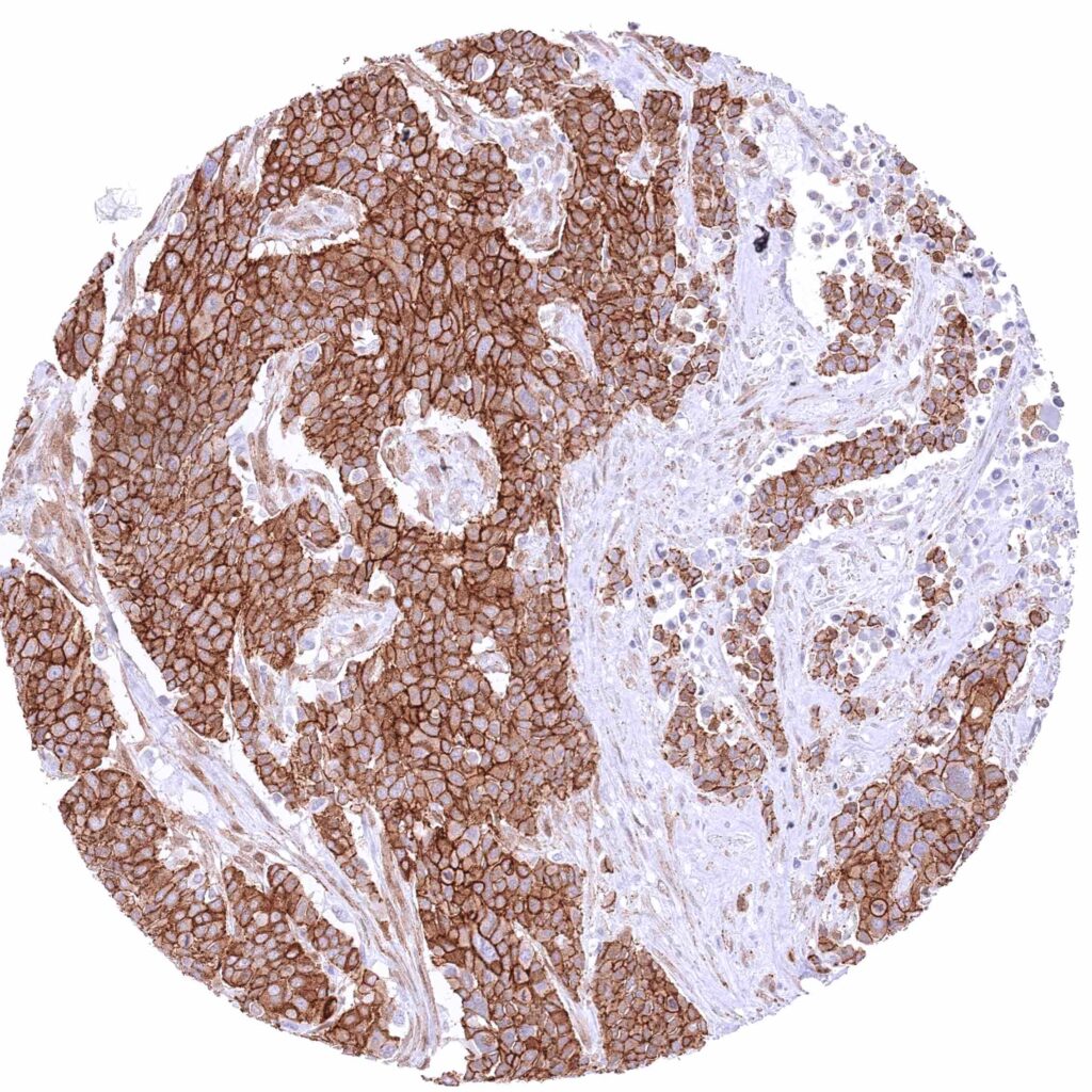 Esophagus – Squamous cell carcinoma with variable, weak to strong membranous β-Catenin staining of tumor cells possibly accompanied by a mild cytoplasmic positivity