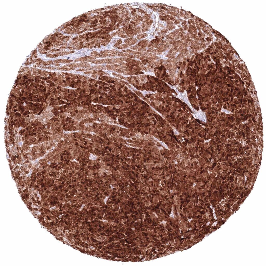 Pancreas – Neuroendocrine tumor with weak membranous, moderate cytoplasmic, and strong nuclear β-Catenin staining of tumor cells.