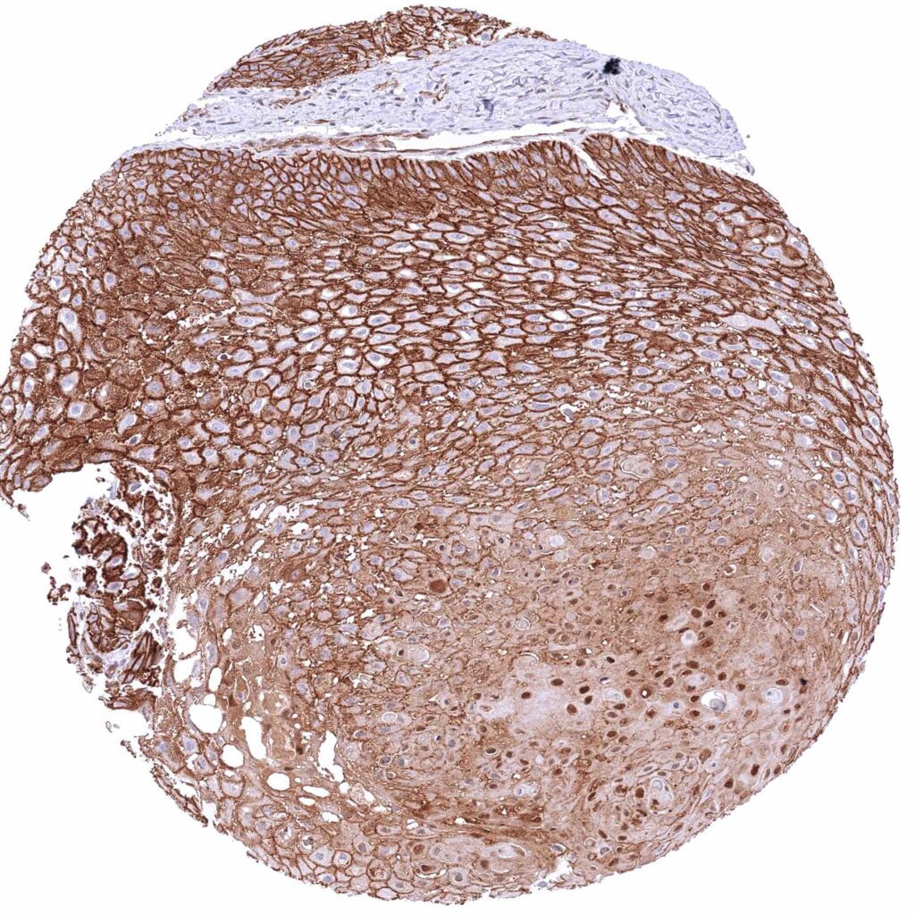 Esophagus – Squamous cell carcinoma with variable, weak to strong membranous β-Catenin staining of tumor cells possibly accompanied by a mild cytoplasmic positivity.