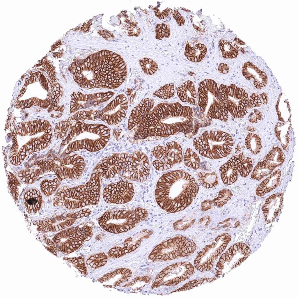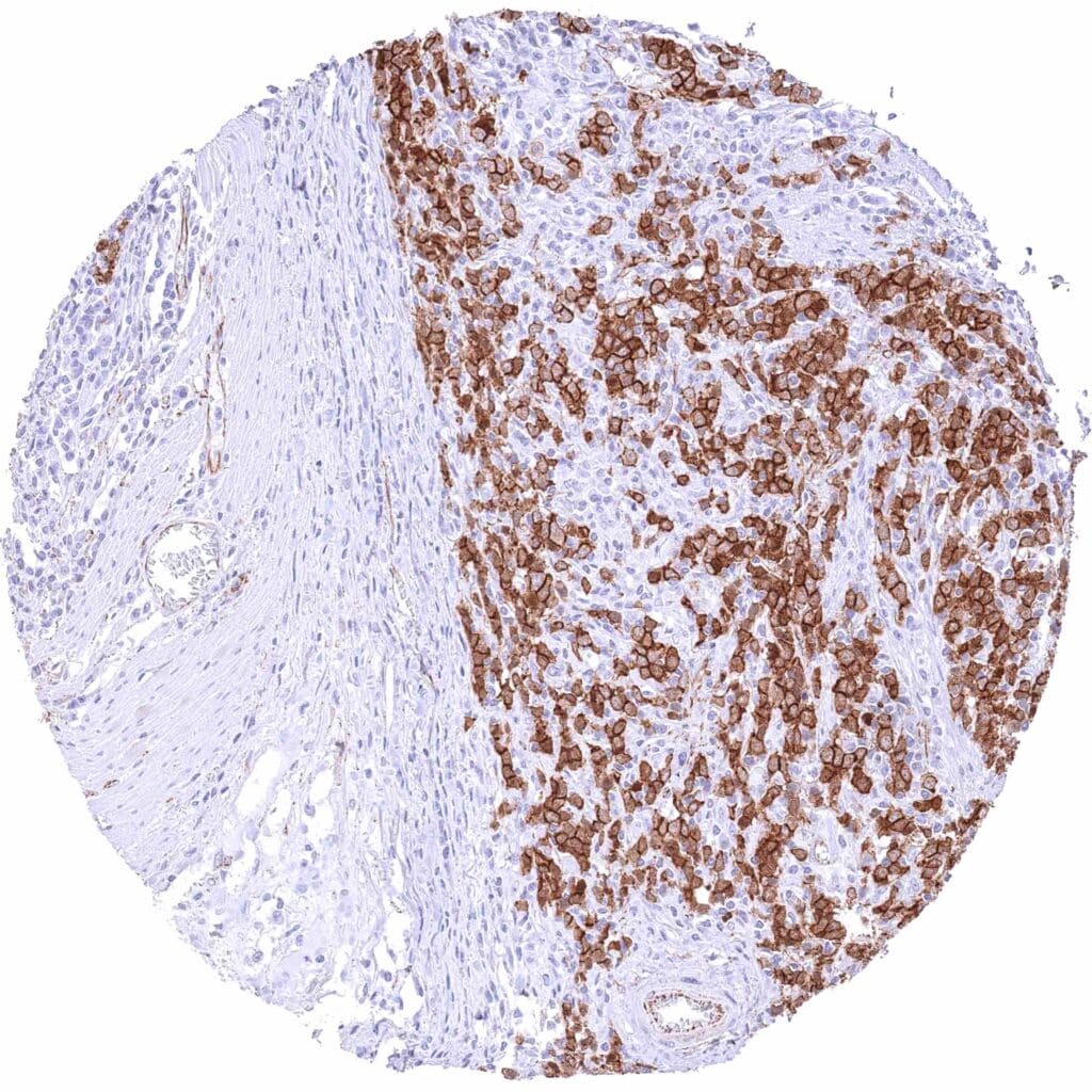 Stomach – Gastric adenocarcinoma (diffuse type) with strong membranous and weak cytoplasmic β-Catenin staining of tumor cells.
