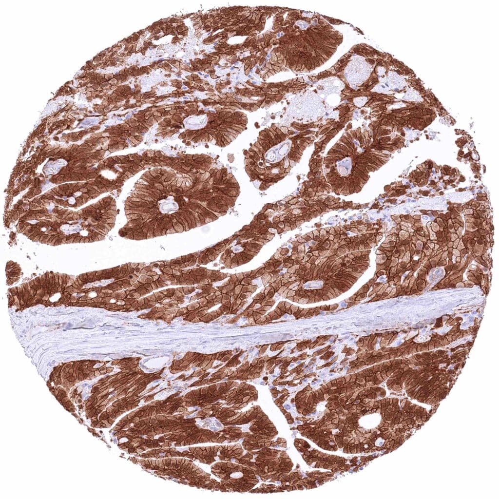 Stomach – Gastric adenocarcinoma (diffuse type) with strong membranous and weak to moderate cytoplasmic β-Catenin staining of tumor cells.