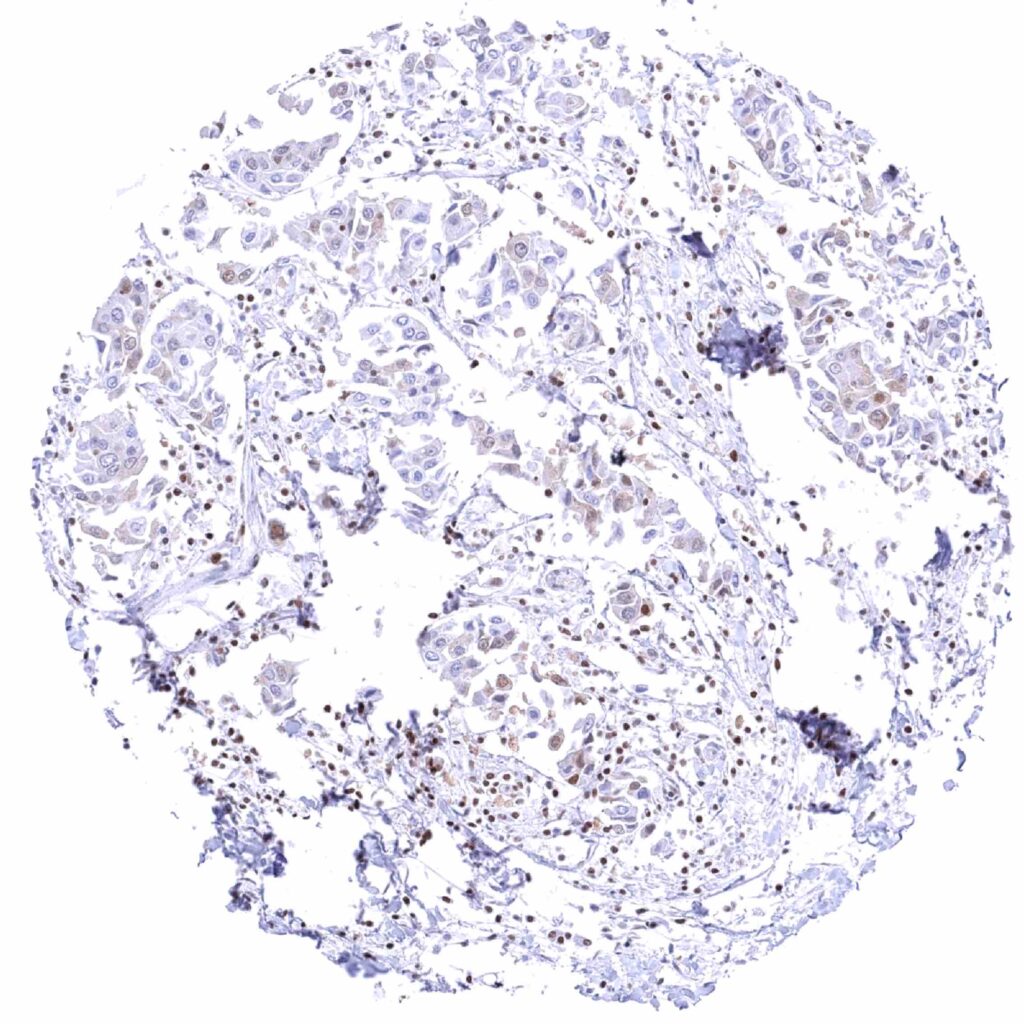 Breast – Invasive breast cancer of no special type (NST) with absent or markedly reduced BRD4 staining of most tumor cells while nuclear BRD4 staining is distinct in inflammatory cells