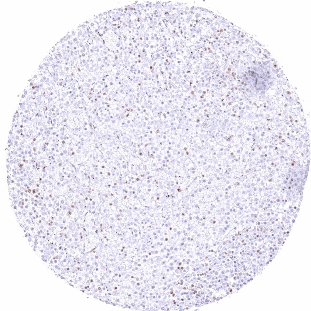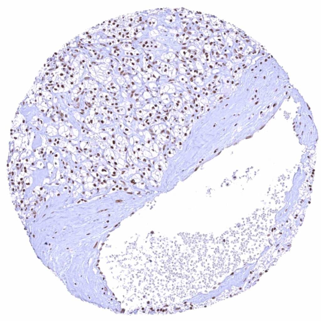 Kidney – Clear cell renal cell carcinoma with weak BRD4 staining of a subset tumor cells. BRD4 staining is more intense in stromal cells.