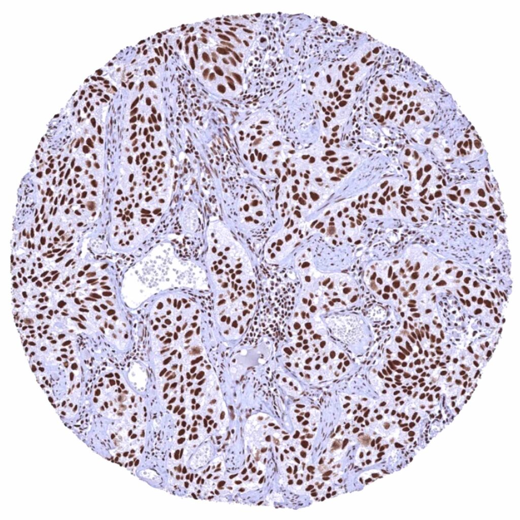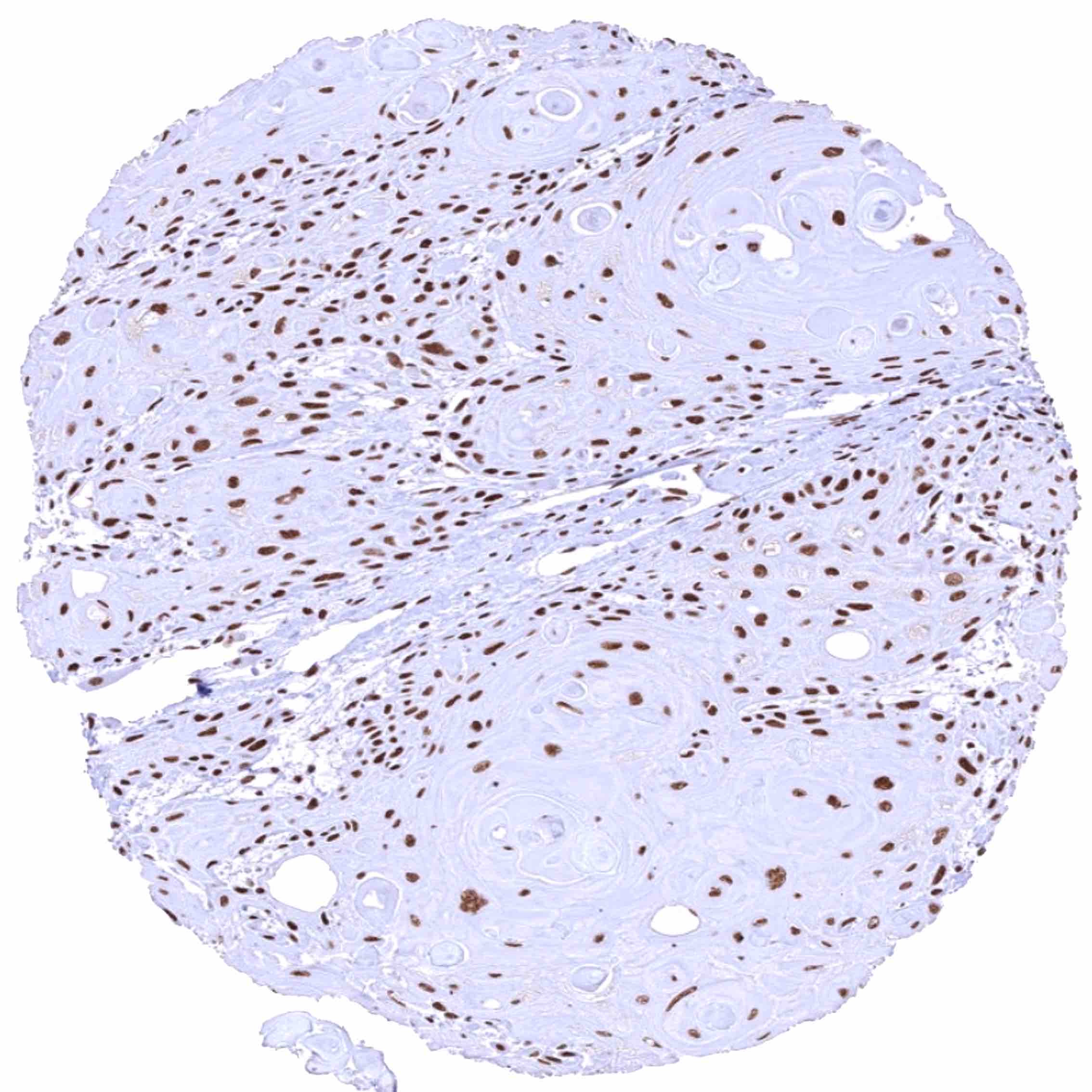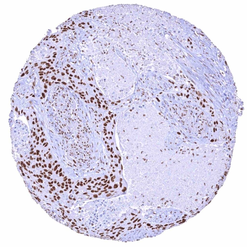 Lung – Squamous cell carcinoma with strong BRD4 staining of tumor cells.