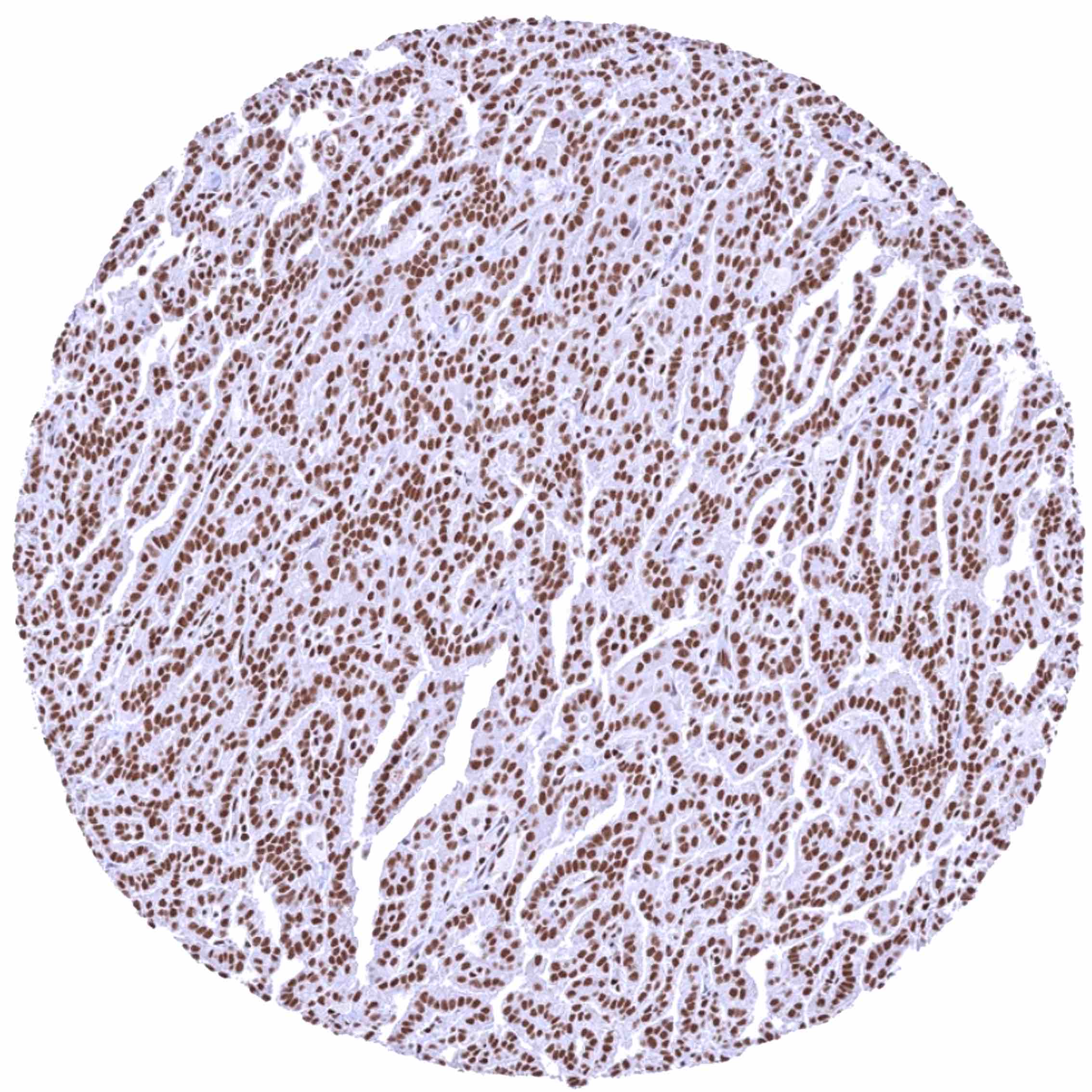 Kidney – Papillary renal cell carcinoma showing an intense BRD4 positivity of all tumor cells.