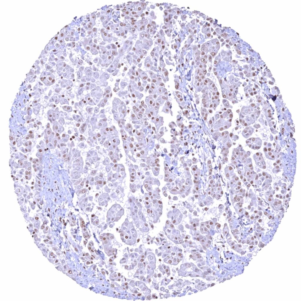 Ovary – Serous high-grade carcinoma with strong BRD4 immunostaining of a small subset of tumor cells while staining is completely absent in most of the remaining cells.