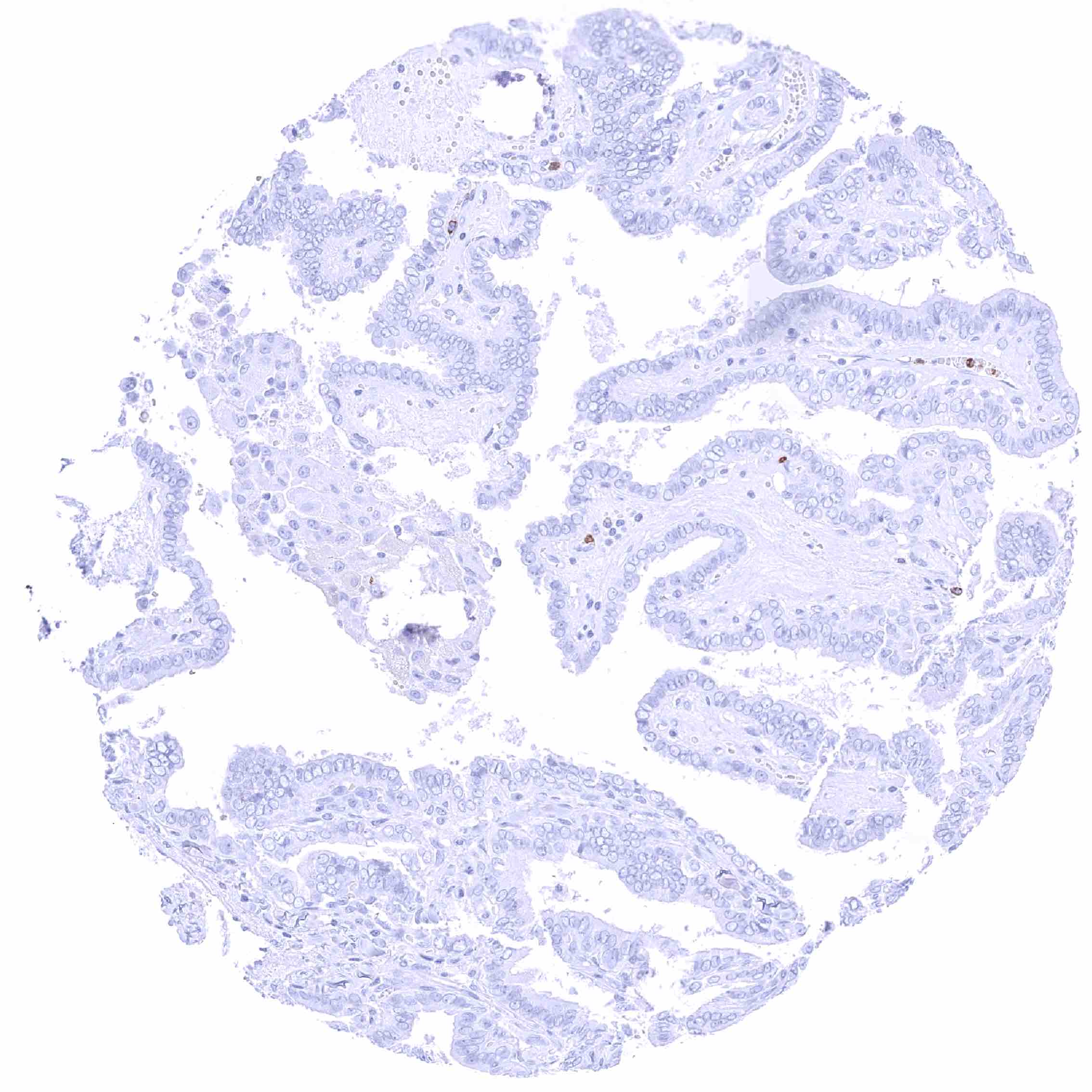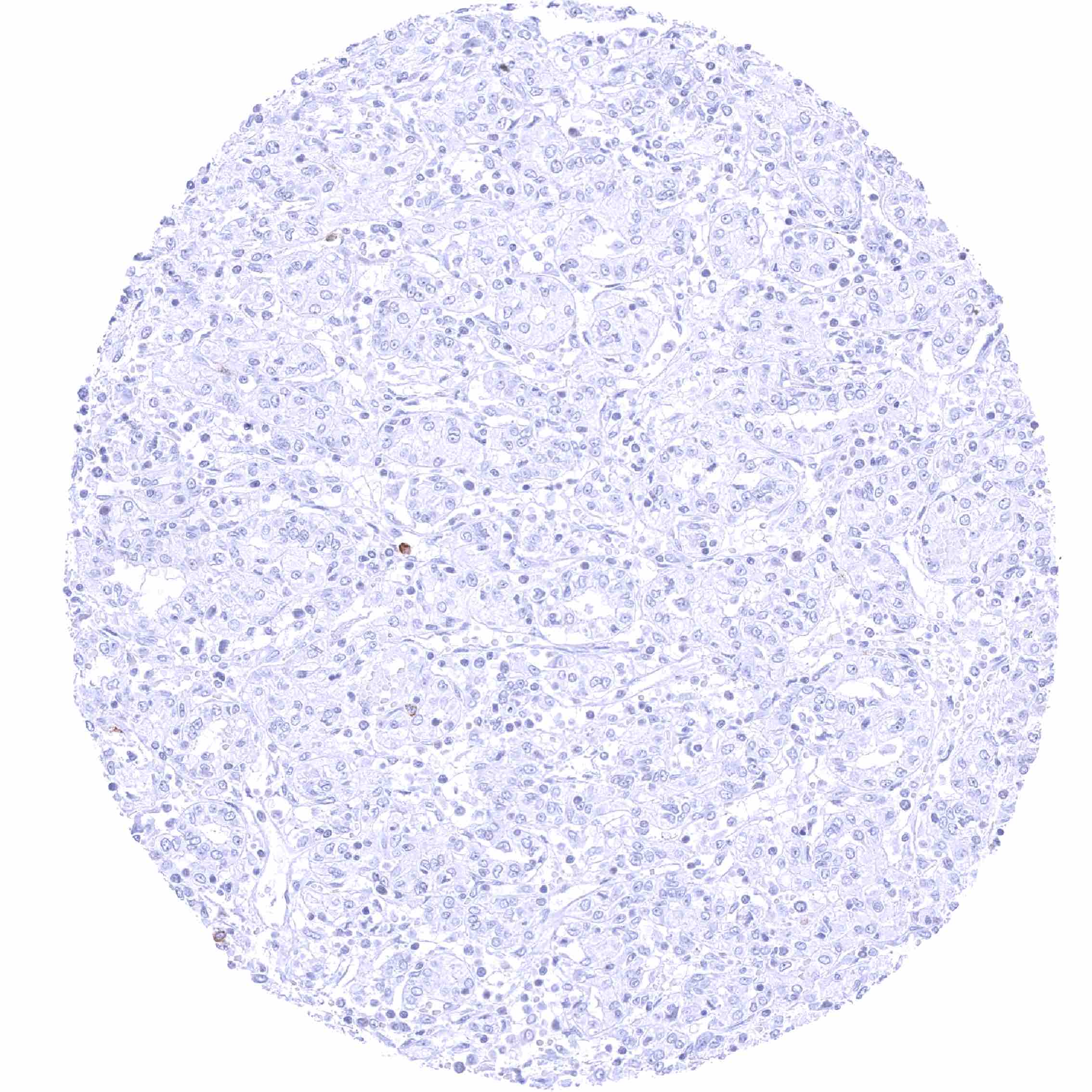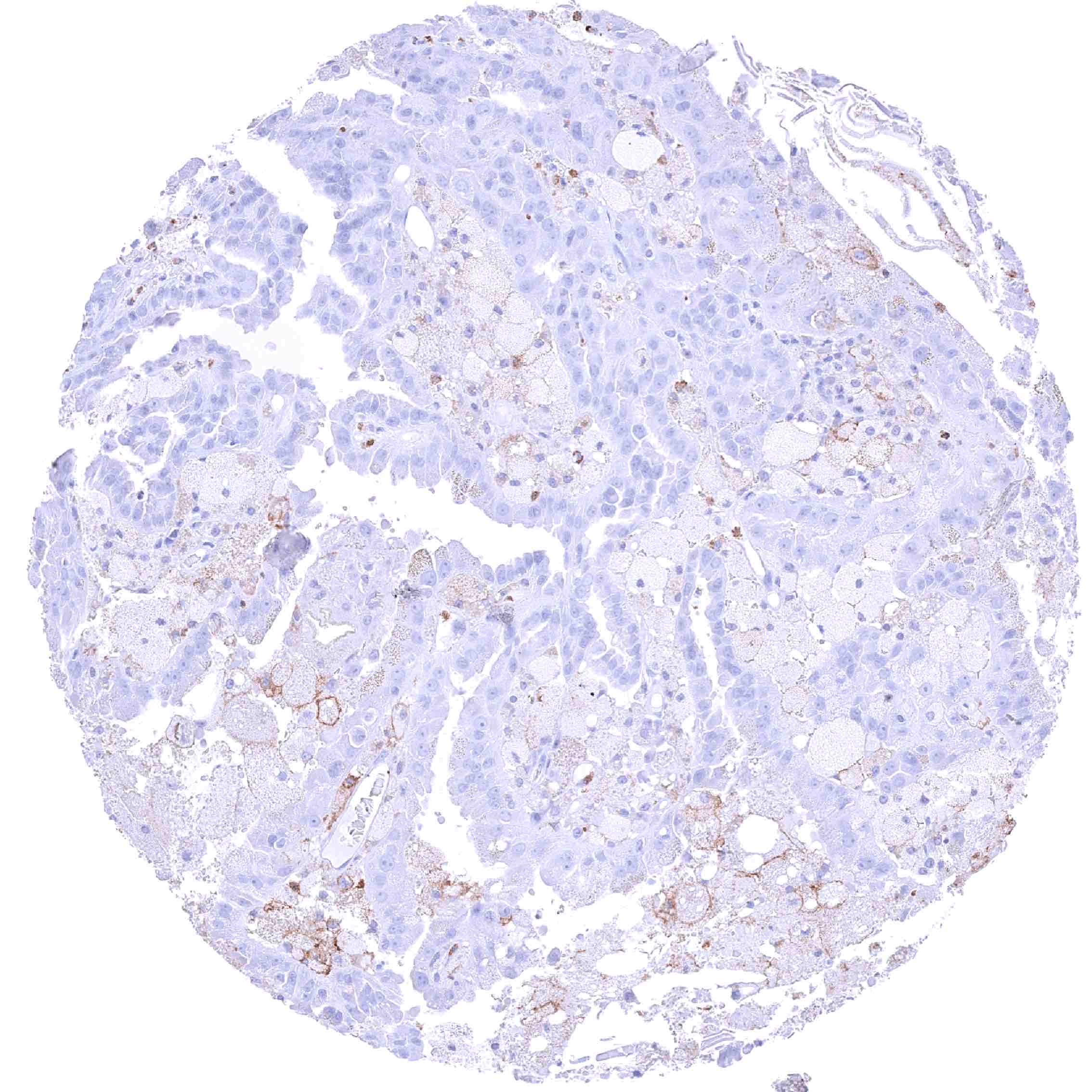 Kidney – CD35 negative papillary renal cell carcinoma. Weak membranous CD35 staining of tumor associated macrophages and CD35 stronger staining of few lymphocytes.