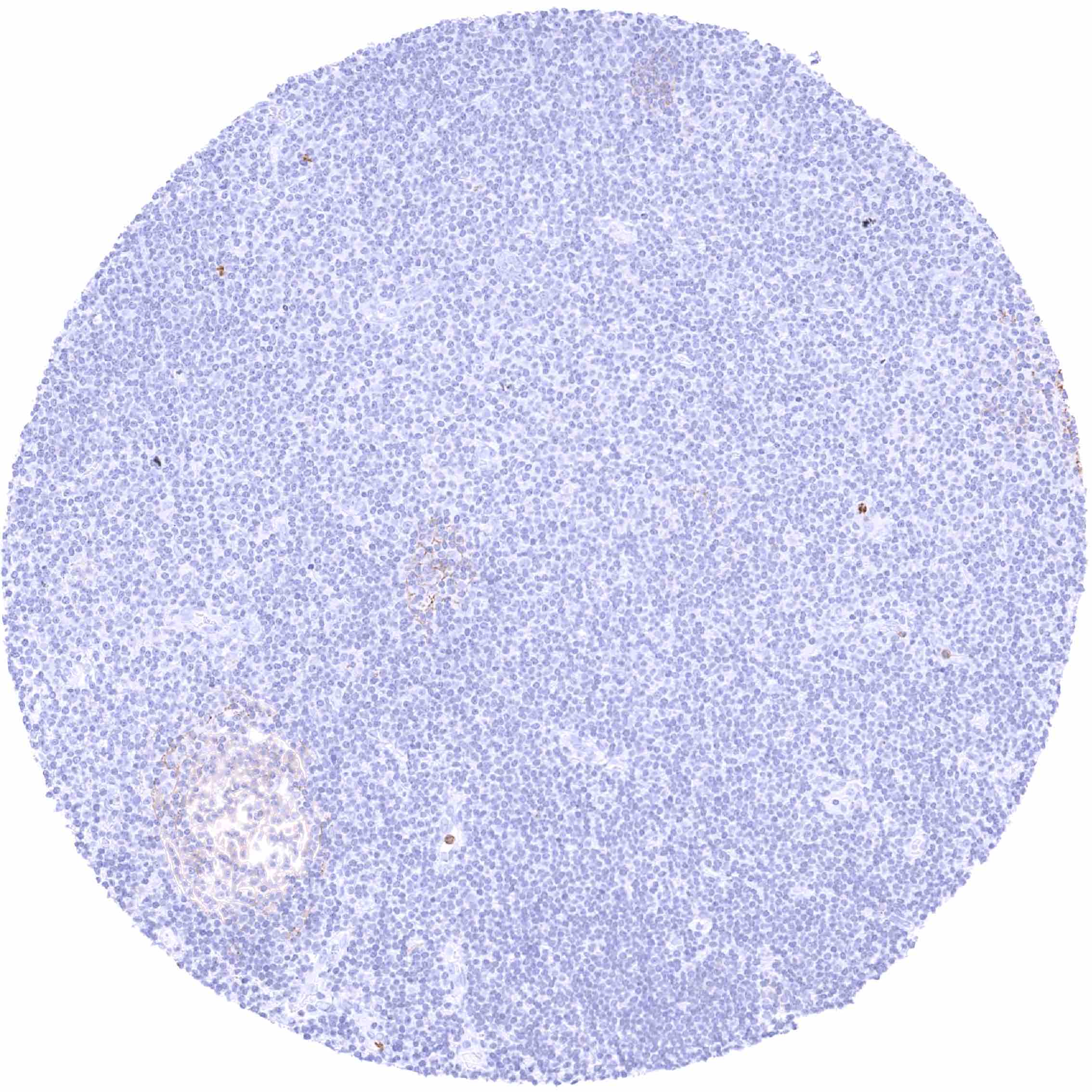 Lymph node – CD35 negative B-CLL. CD35 staining of follicular dendritic cells in a retained normal germinal centre.
