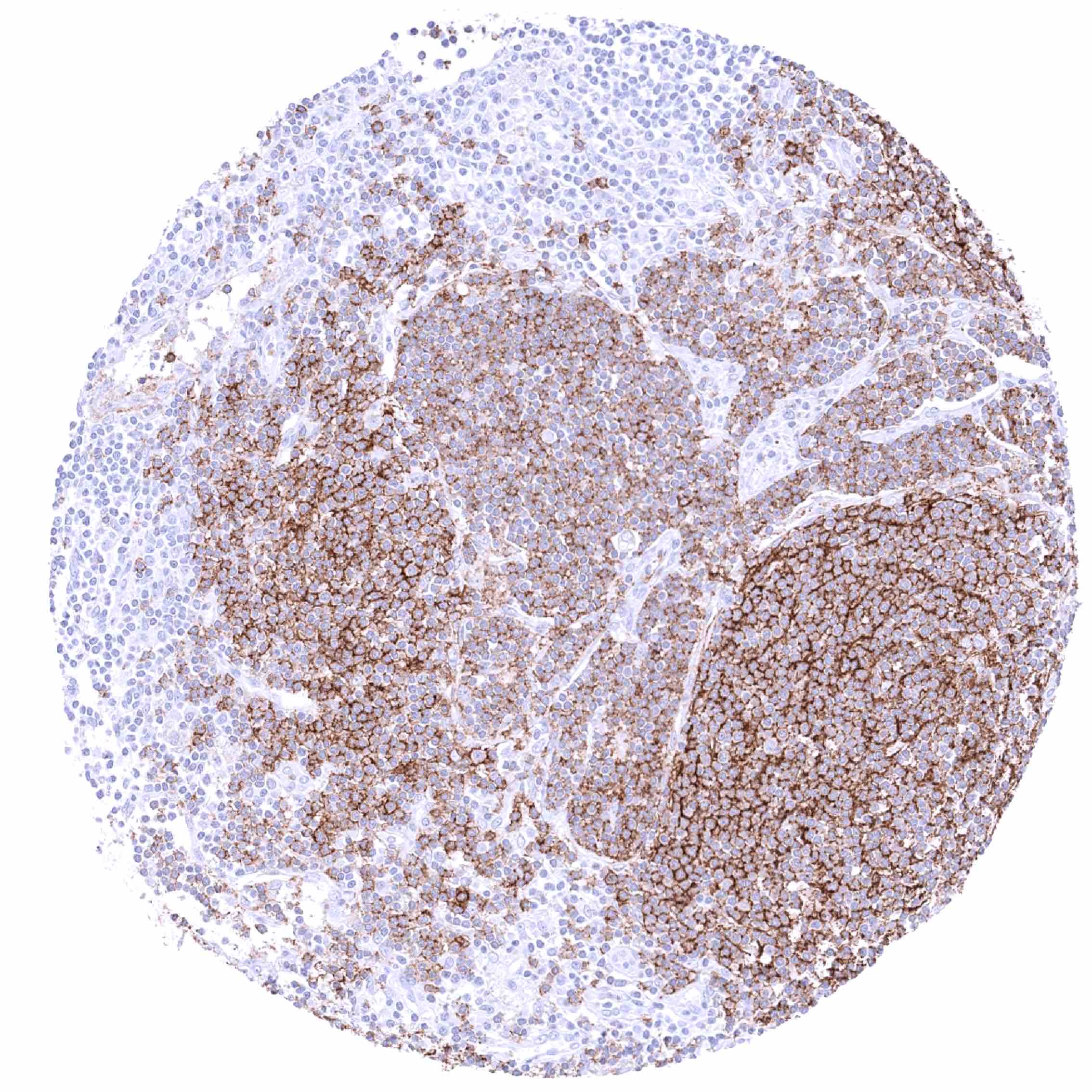 Lymph node – Diffuse large B-cell lymphoma with variable membranous CD35 immunostaining of tumor cells.
