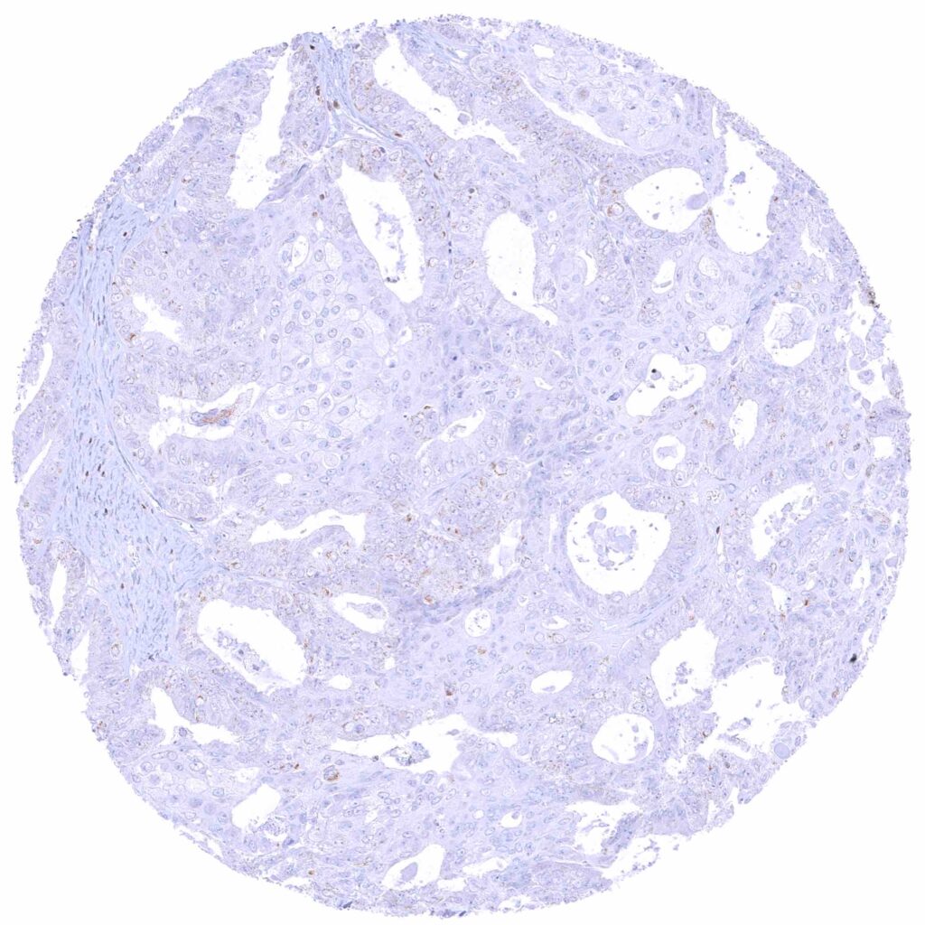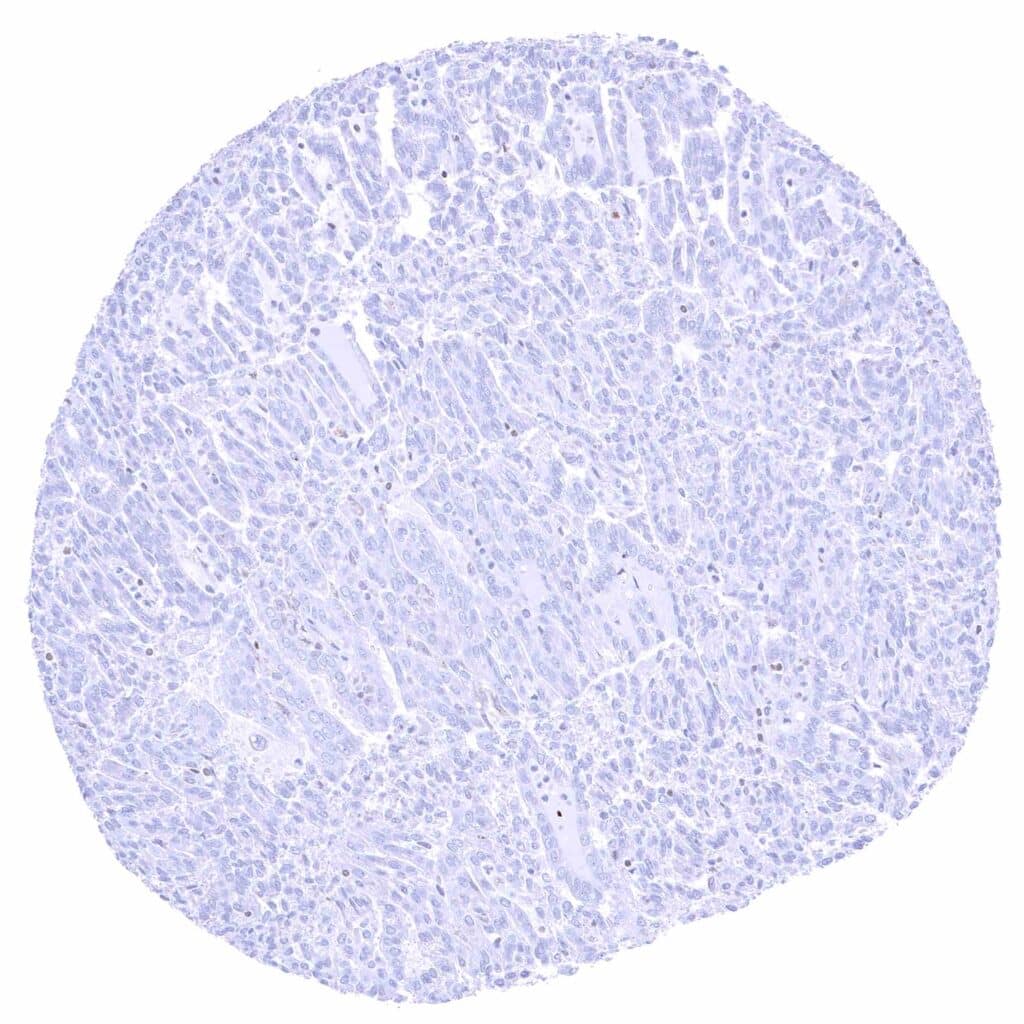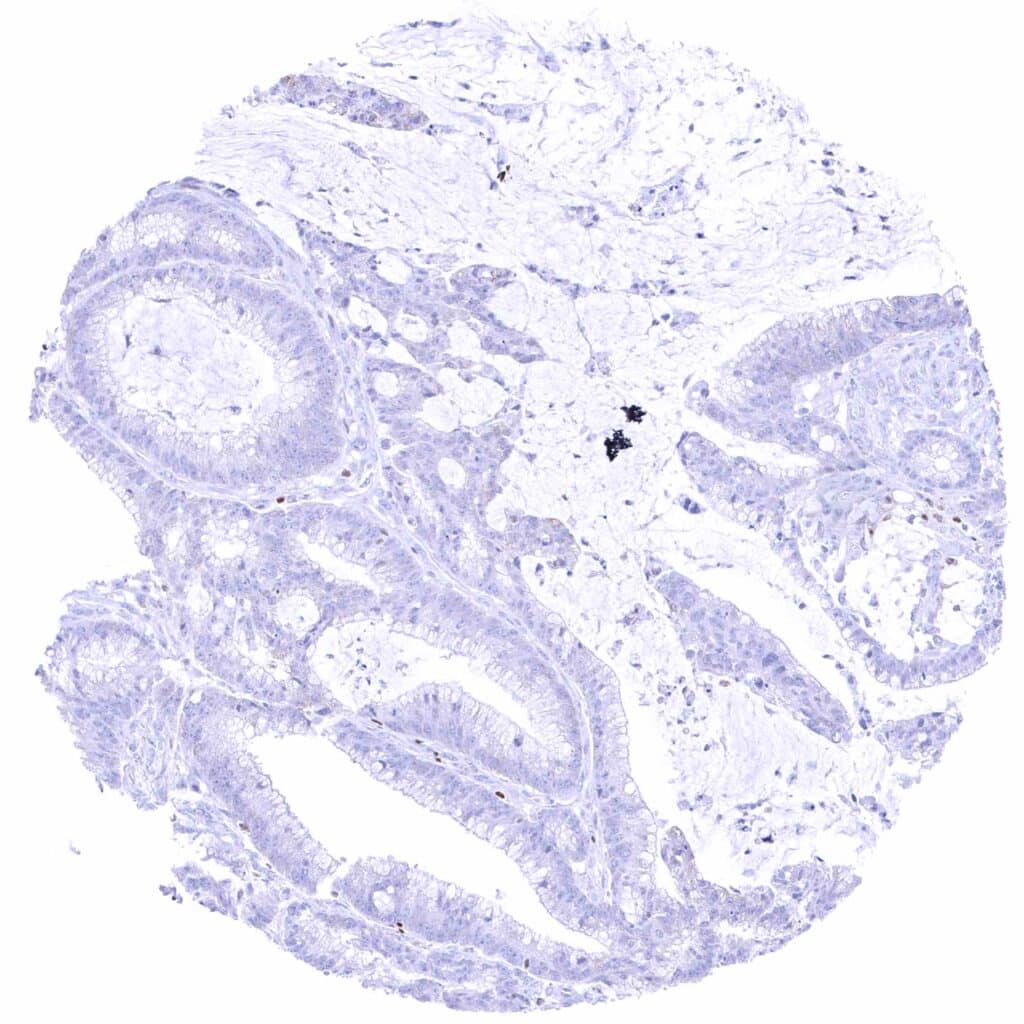 Colon – GATA3 negative colorectal adenocarcinoma. Few lymphocytes with nuclear GATA3 positivity.
