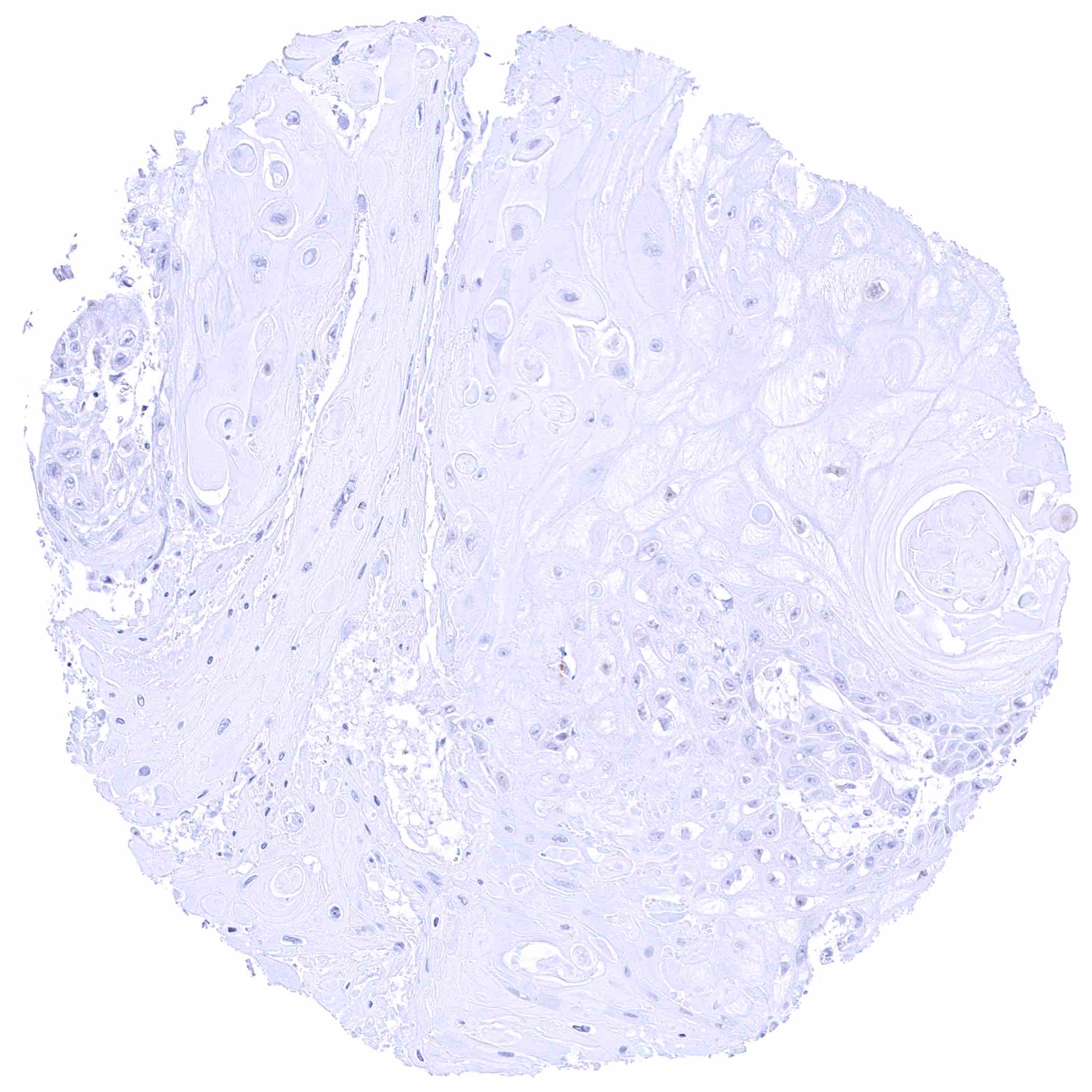 Oral cavity – Squamous cell carcinoma with weak nuclear GATA3 staining of about 40_ of tumor cells.