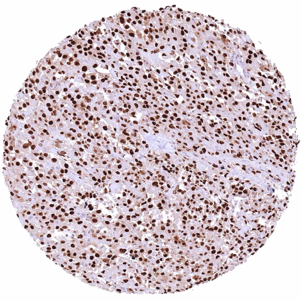 Ovary – Malignant mixed Mullerian tumor with strong, predominantly nuclear p27 staining of a large subset of tumor cells.