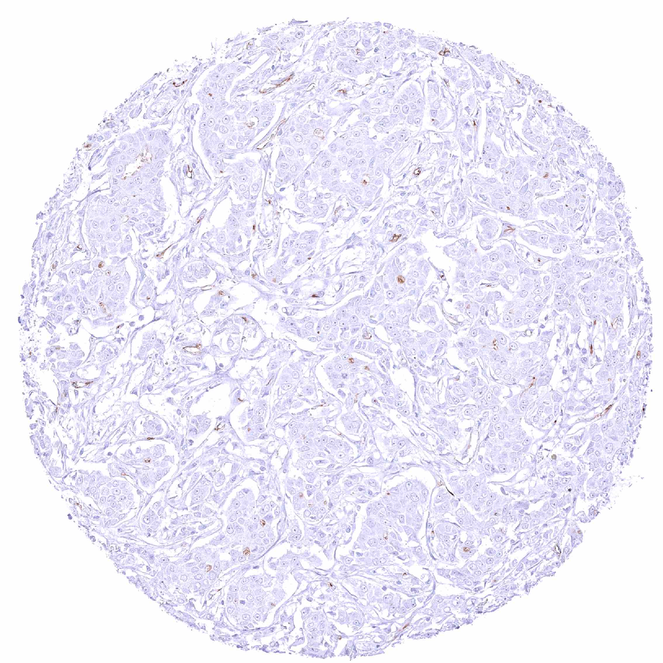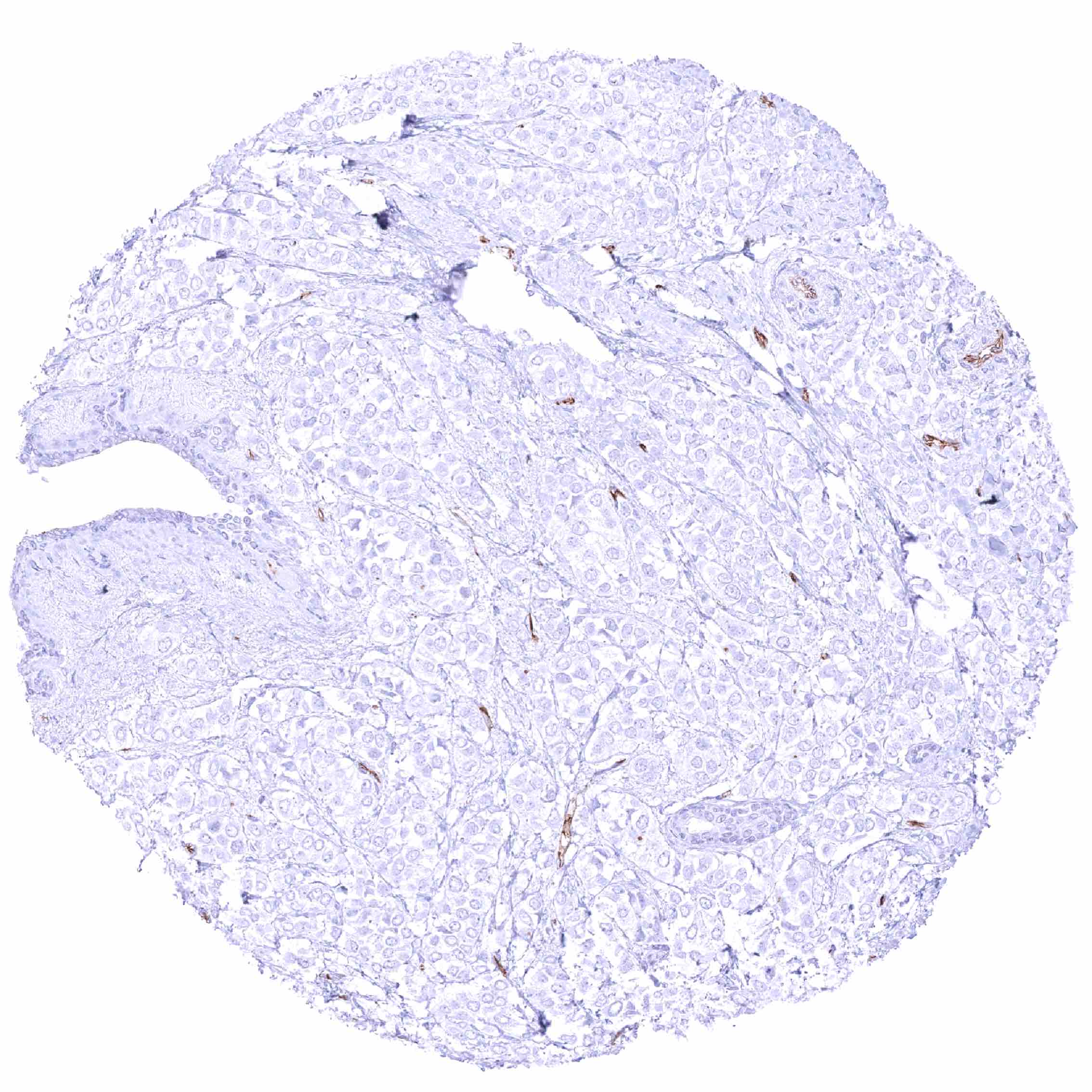 Breast – PODXL negative invasive lobular breast cancer. Distinct PODXL positivity of endothelial cells of tumor associated vasculature.