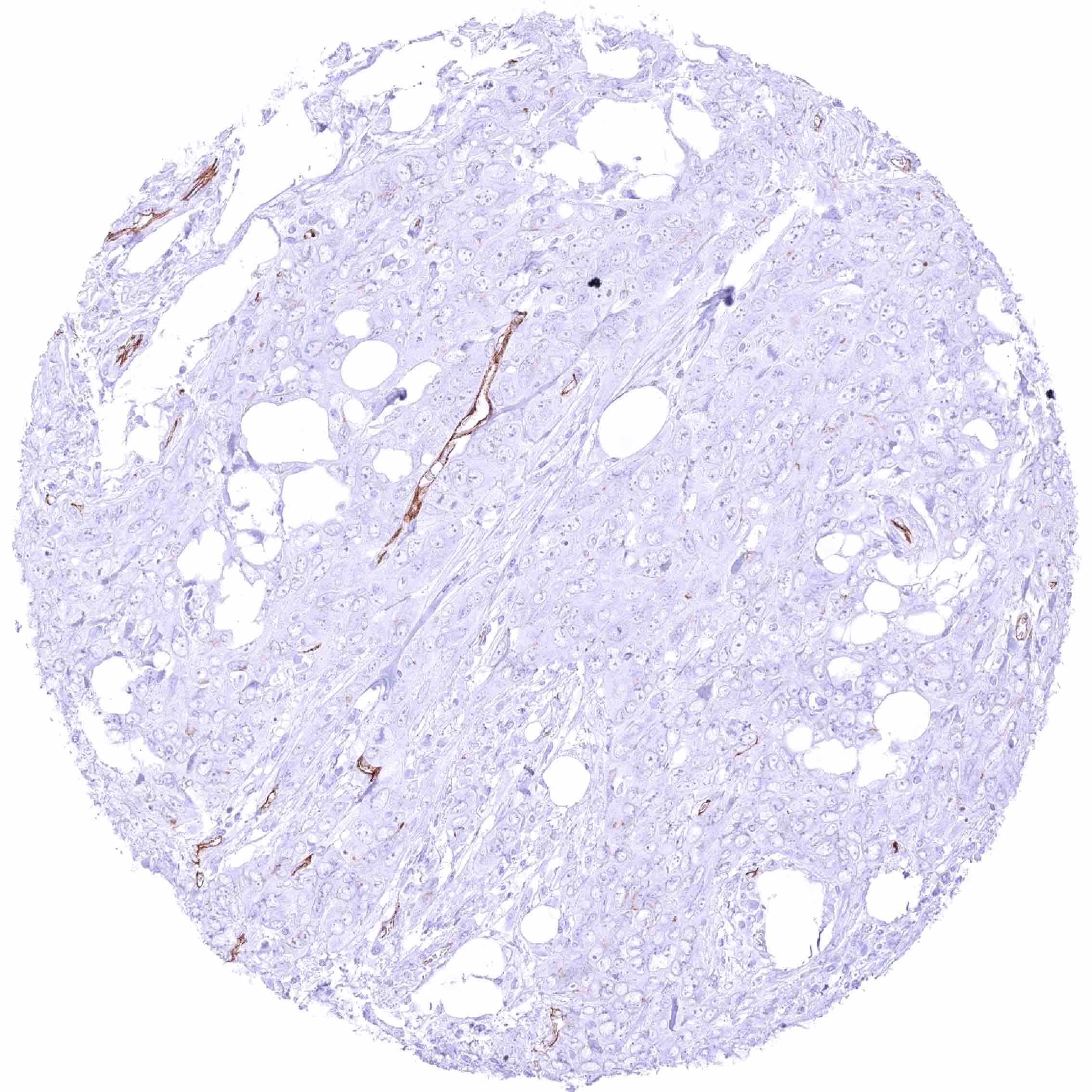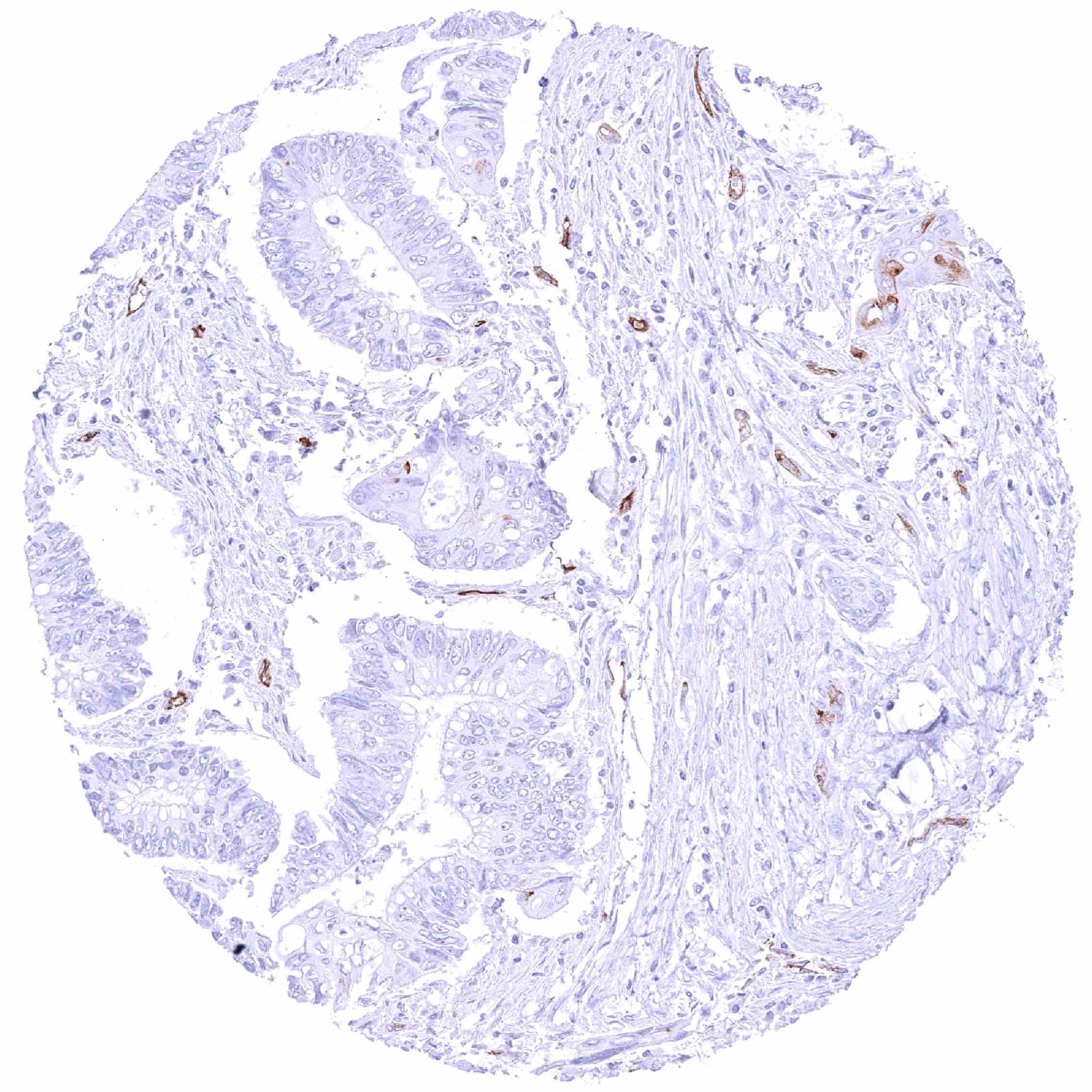 Colon – PODXL negative colorectal adenocarcinoma. Distinct PODXL positivity of endothelial cells of tumor associated vasculature.