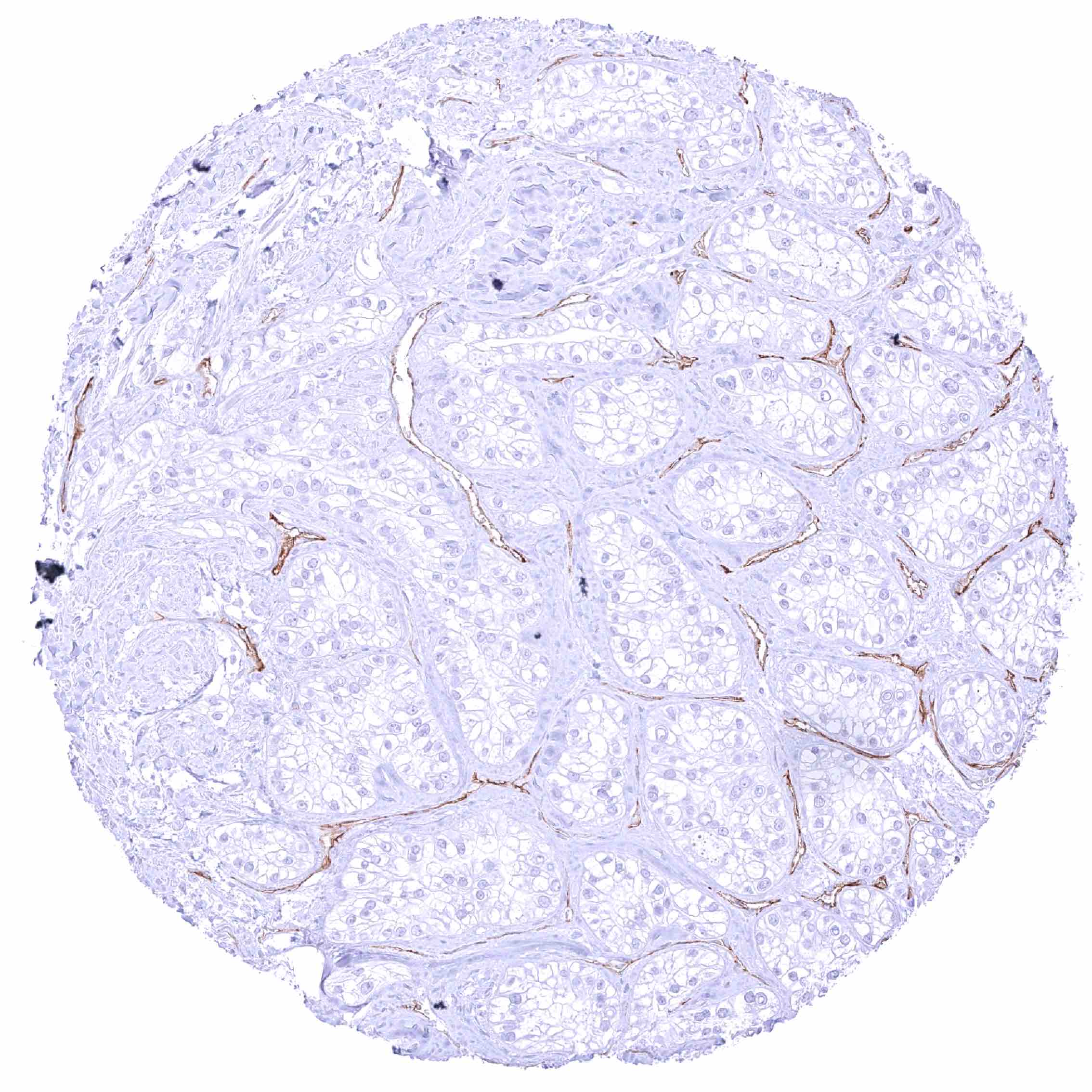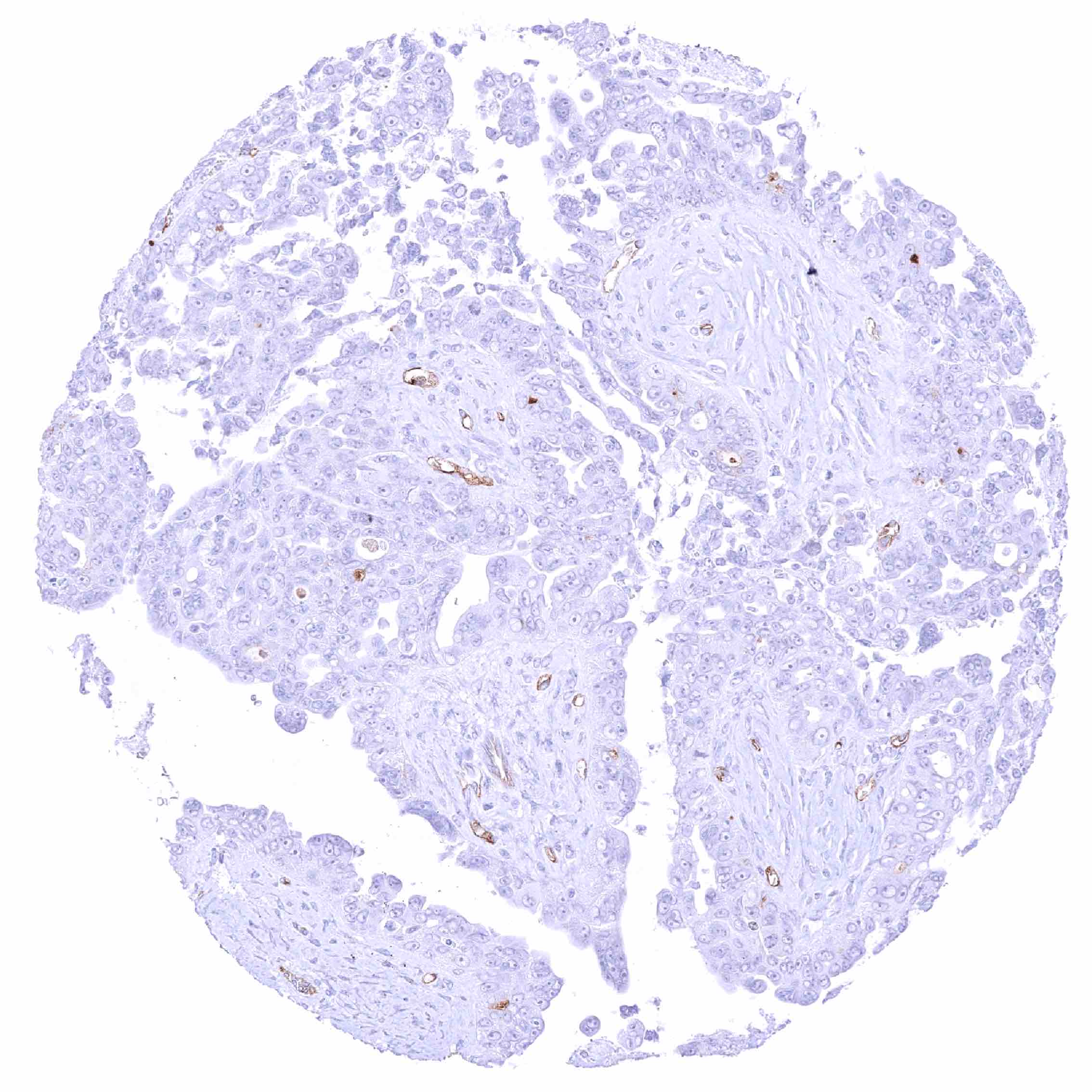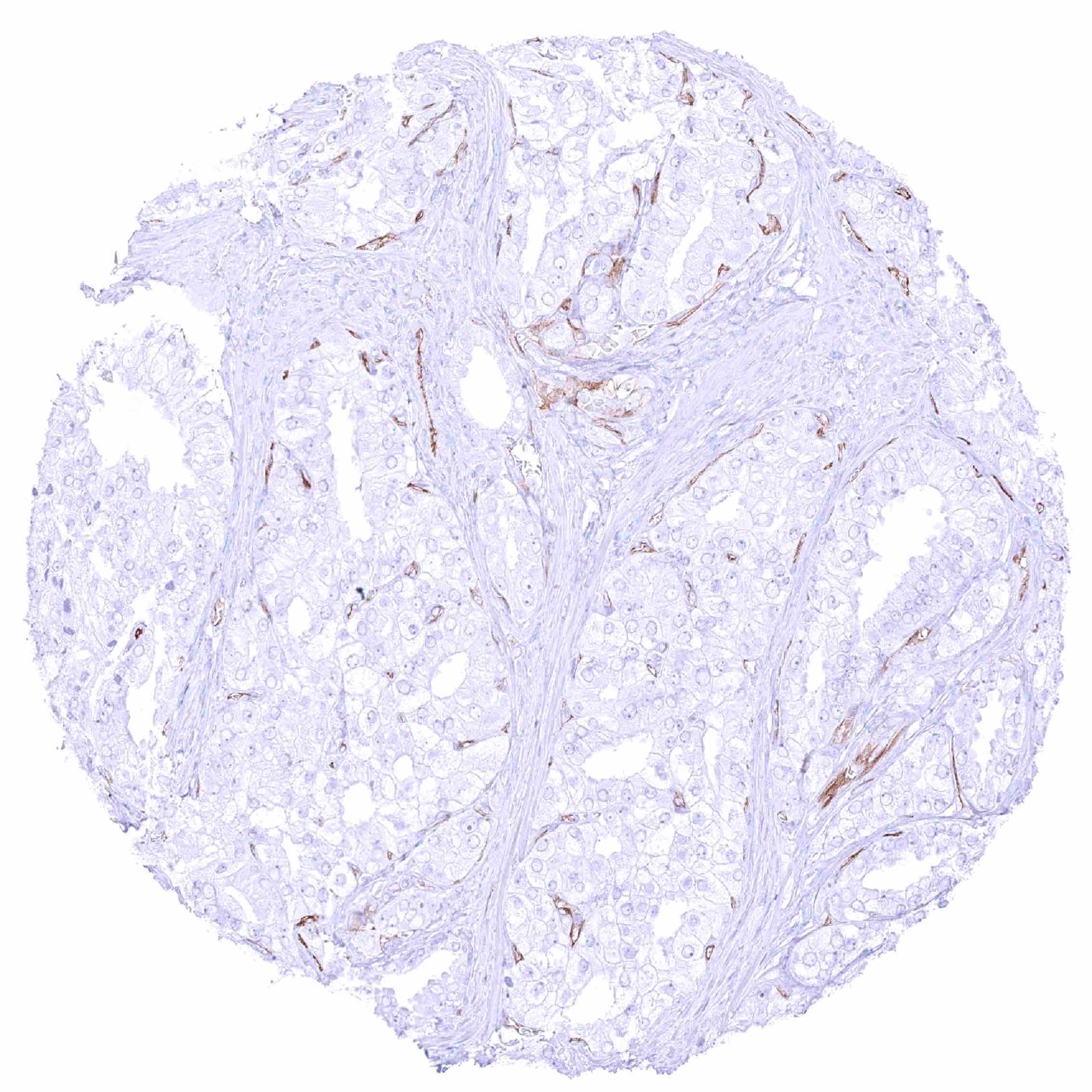 Kidney – PODXL negative papillary renal cell carcinoma. Distinct PODXL positivity of endothelial cells of tumor associated vasculature.