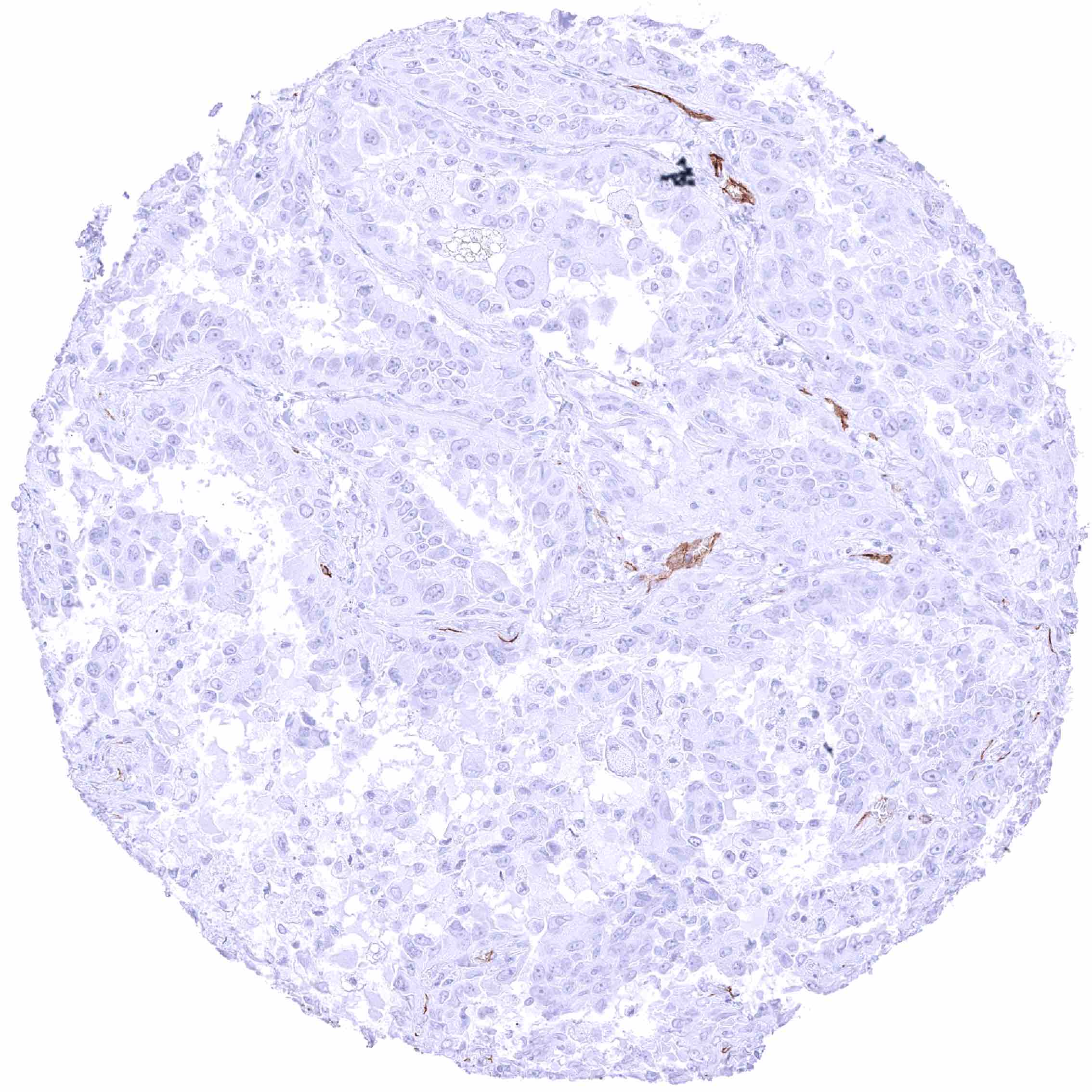 Urinary bladder – PODXL negative muscle-invasive urothelial carcinoma. Distinct PODXL positivity of endothelial cells of few vessels.