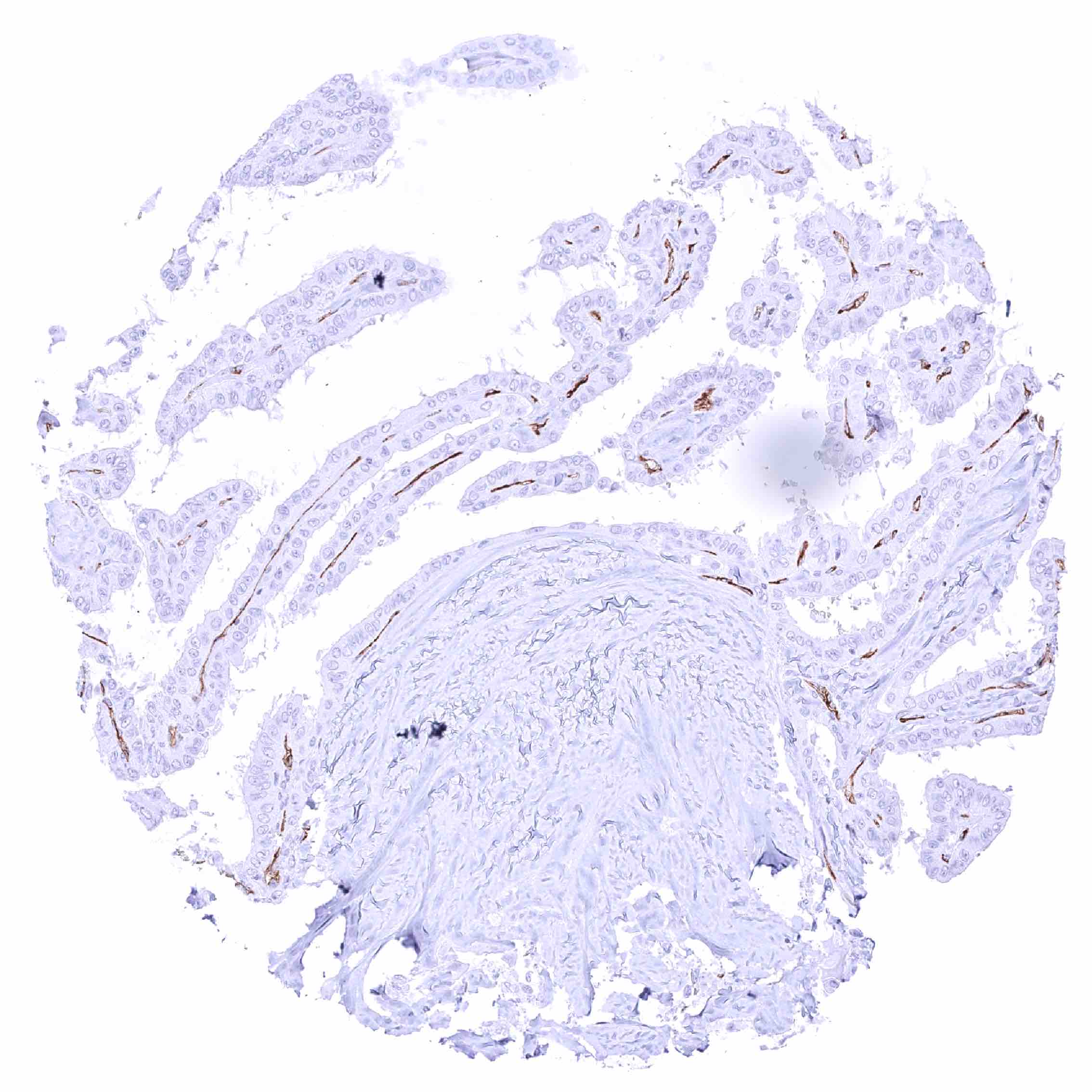 Thyroid – PODXL negative papillary carcinoma. Distinct PODXL positivity of endothelial cells of tumor associated vasculature.