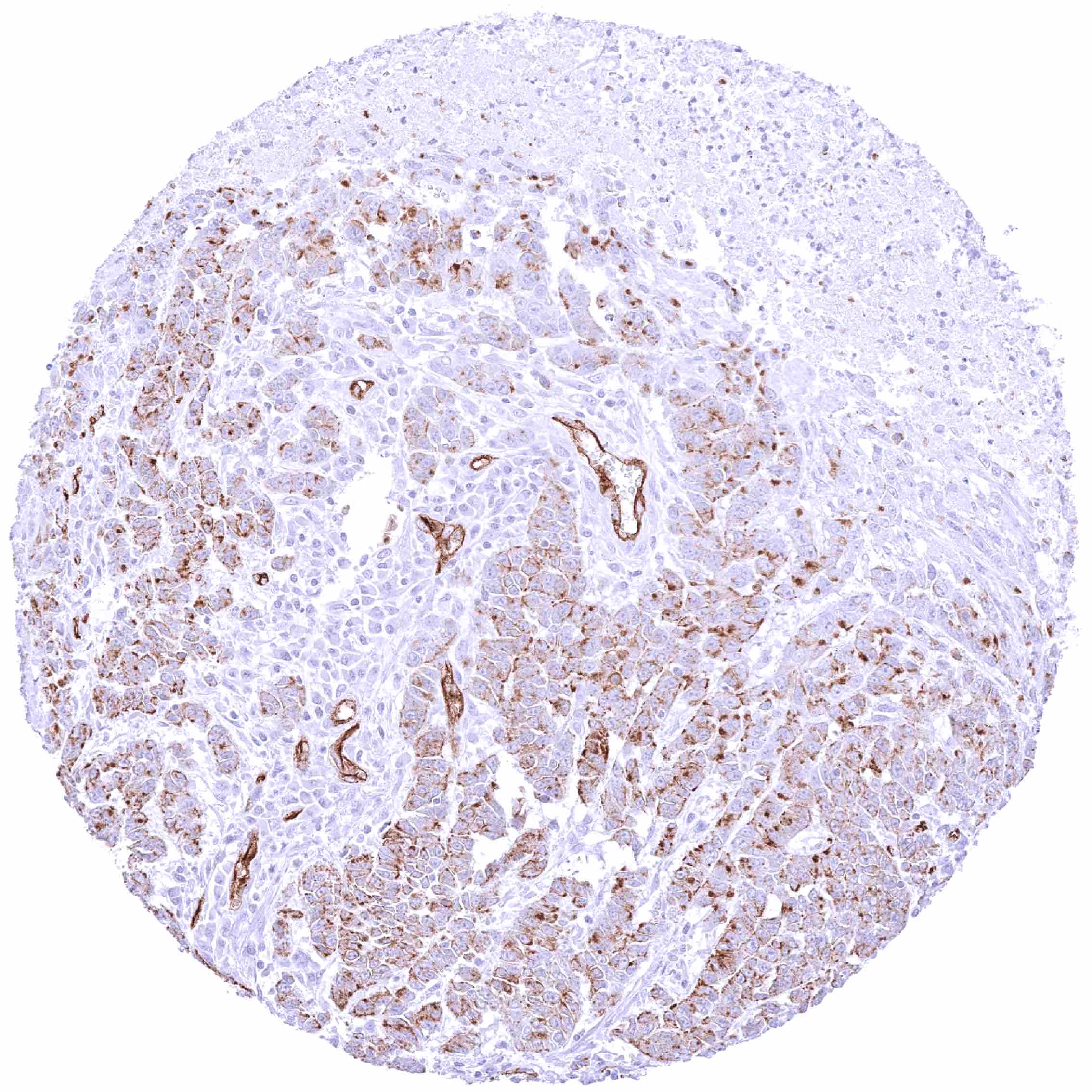 Prostate – PODXL negative adenocarcinoma (Gleason 4+3=7). Distinct PODXL positivity of endothelial cells of tumor associated vasculature.