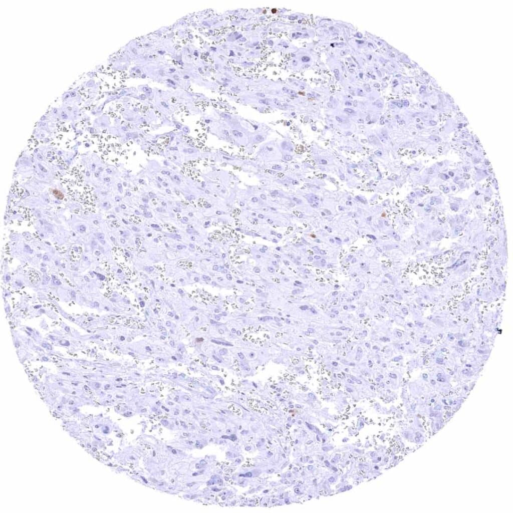 Colon – TYMS negative colorectal adenocarcinoma. TYMS staining is only seen in some inflammatory cells