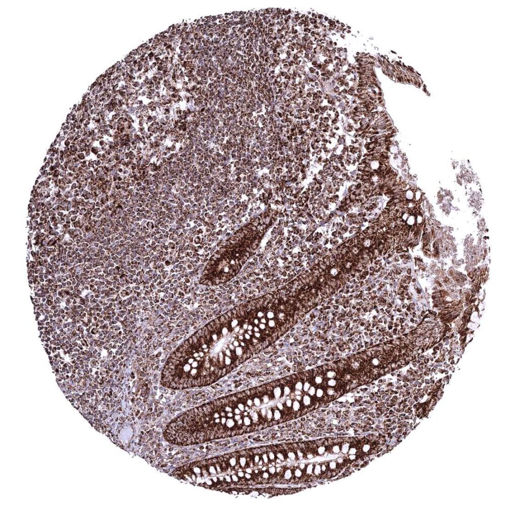 Adrenal gland – Cytoplasmic ATP5J staining occurs in all cell types. It is particularly strong in adrenocortical cells
