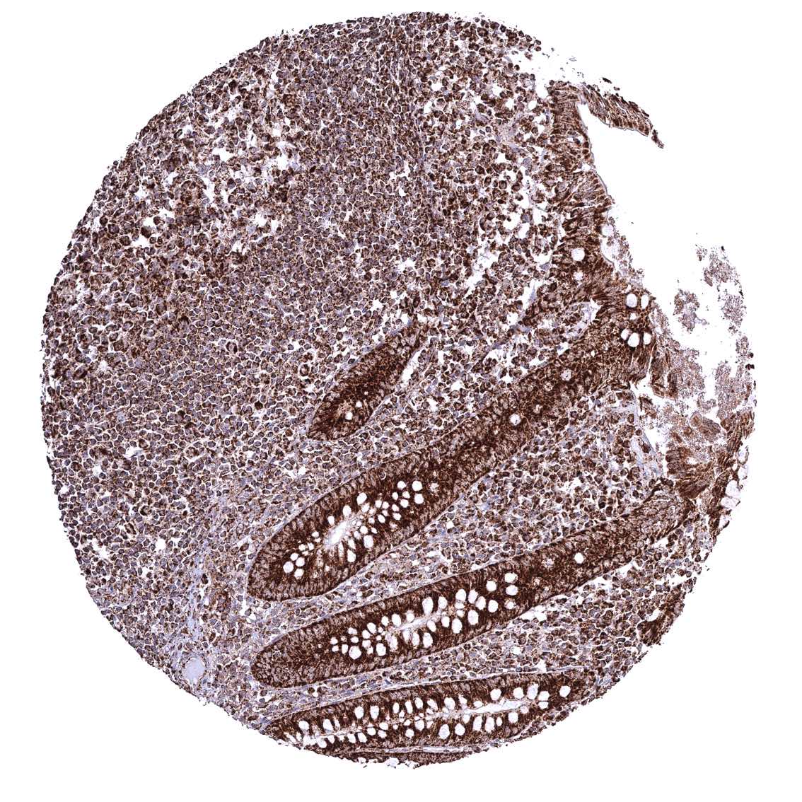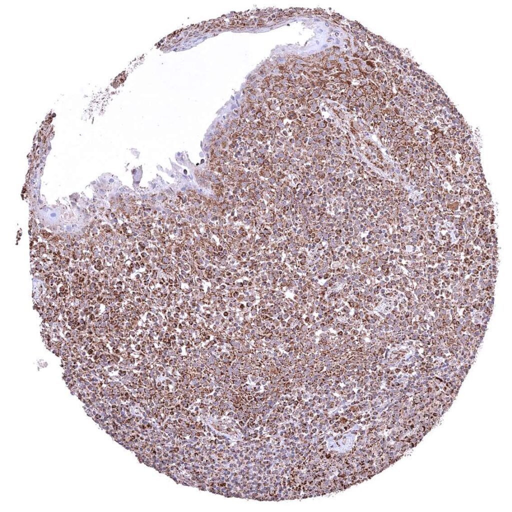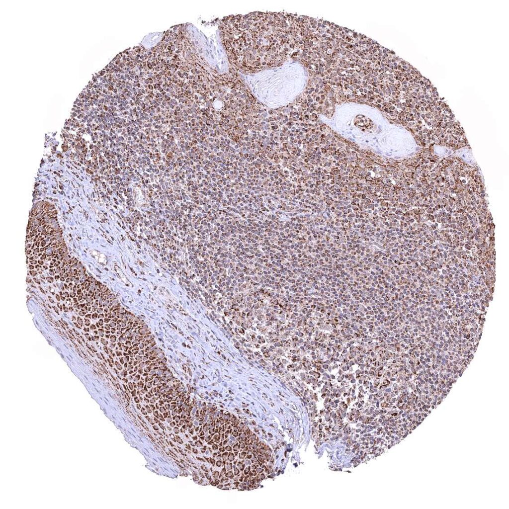 Tonsil – Strong granular cytoplasmic ATP5J staining of all cell types. The staining is least intense in superficial cell layers of squamous epithelium.
