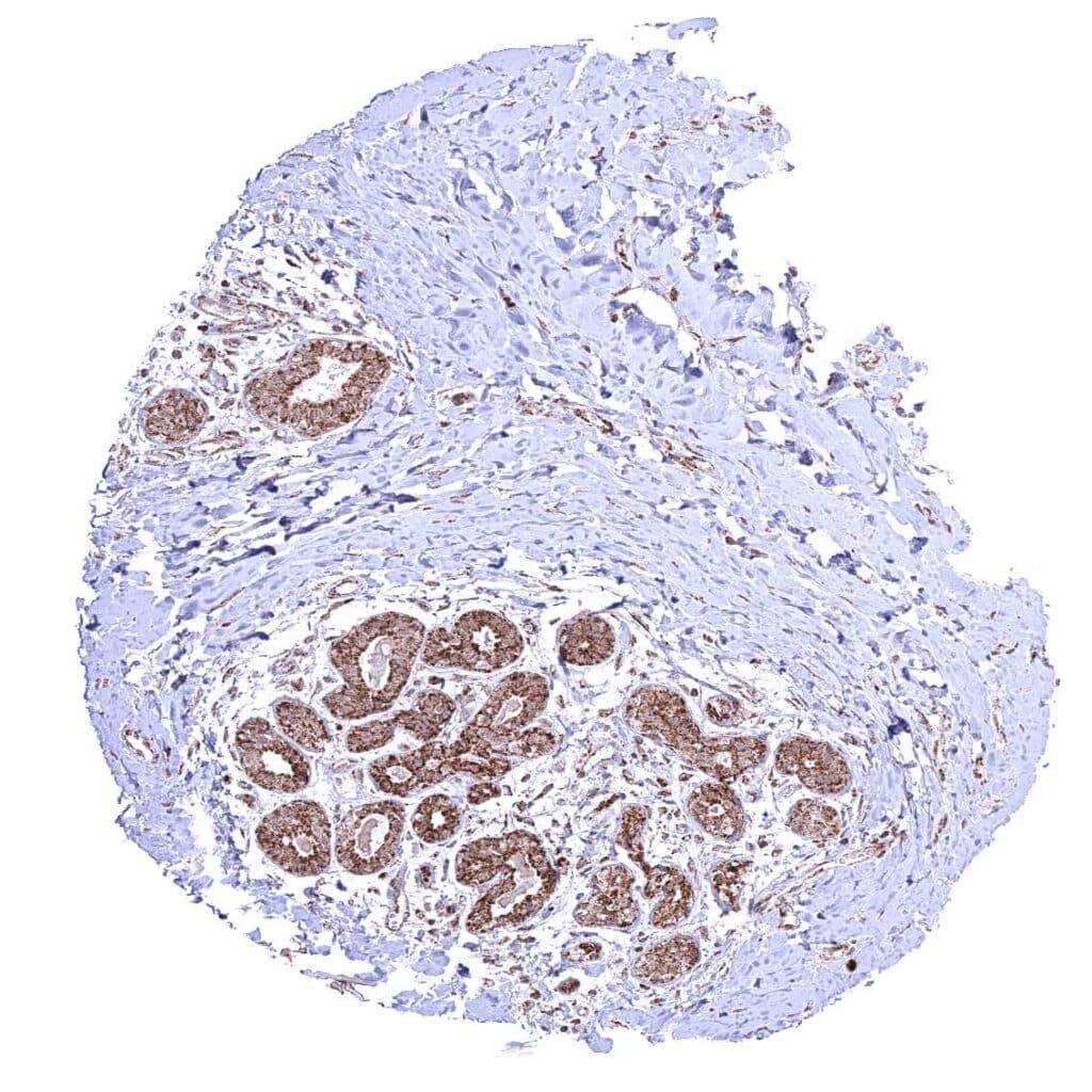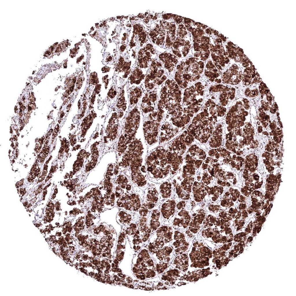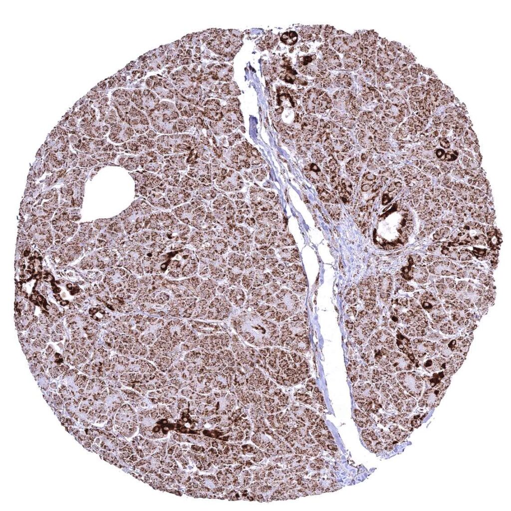 Pancreas – Distinct granular, perinuclear, cytoplasmic ATP5J staining in all cell types. Some cells with higher staining intensity may be related to the excretory system.