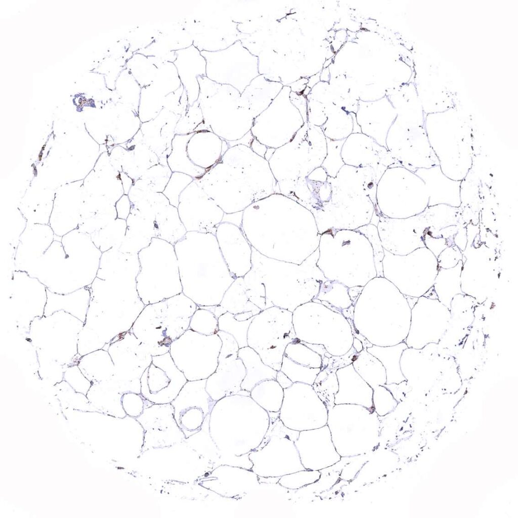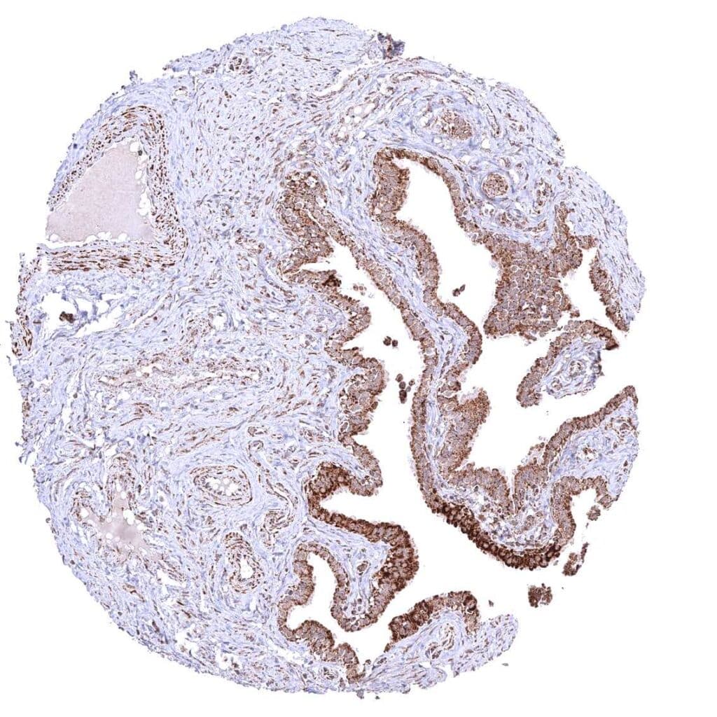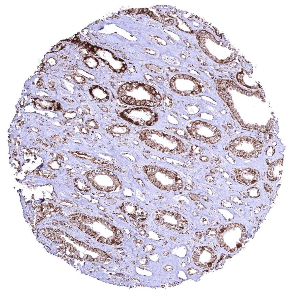 Pancreas – Distinct granular, perinuclear, cytoplasmic ATP5J staining in all cell types. Some cells with higher staining intensity may be related to the excretory system.