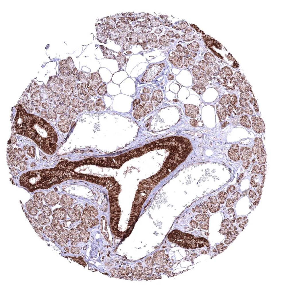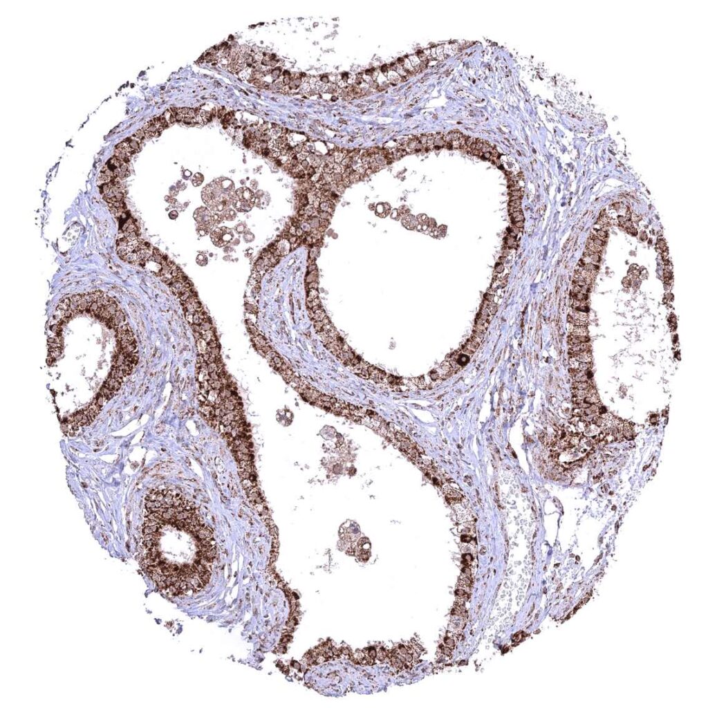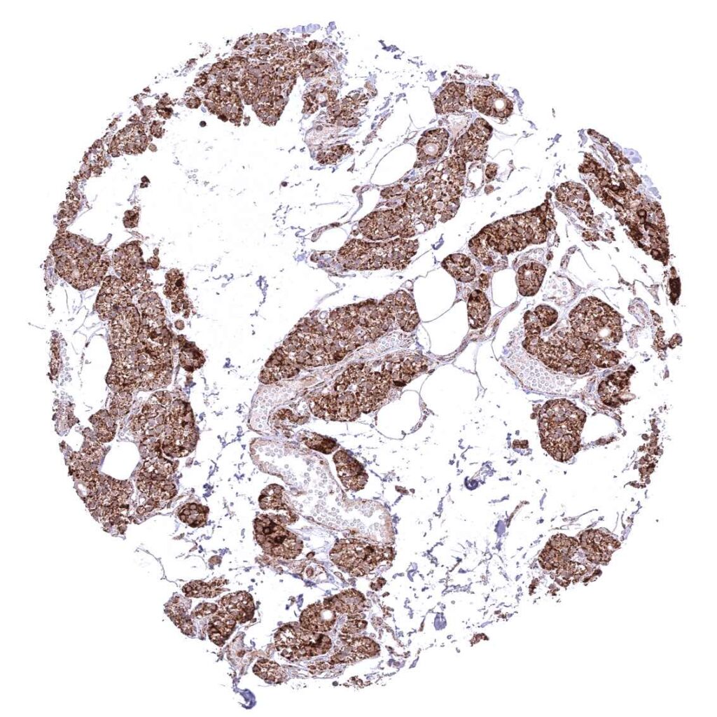 Parotid gland – Cytoplasmic ATP5J staining occurs in all cell types. It is very intense in excretory ducts but rather weak in glandular cells.