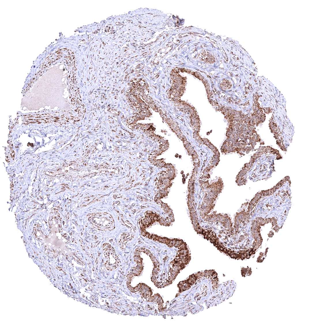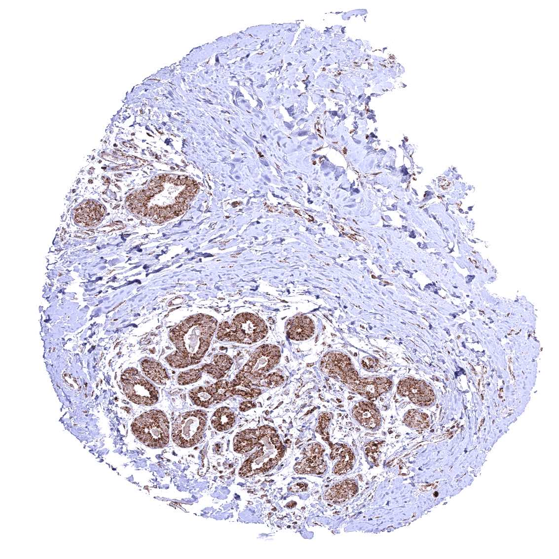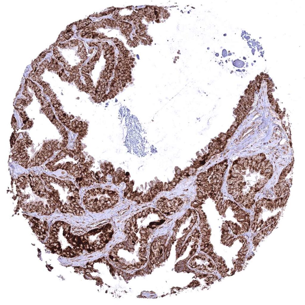 Parotid gland – Cytoplasmic ATP5J staining occurs in all cell types. It is very intense in excretory ducts but rather weak in glandular cells.