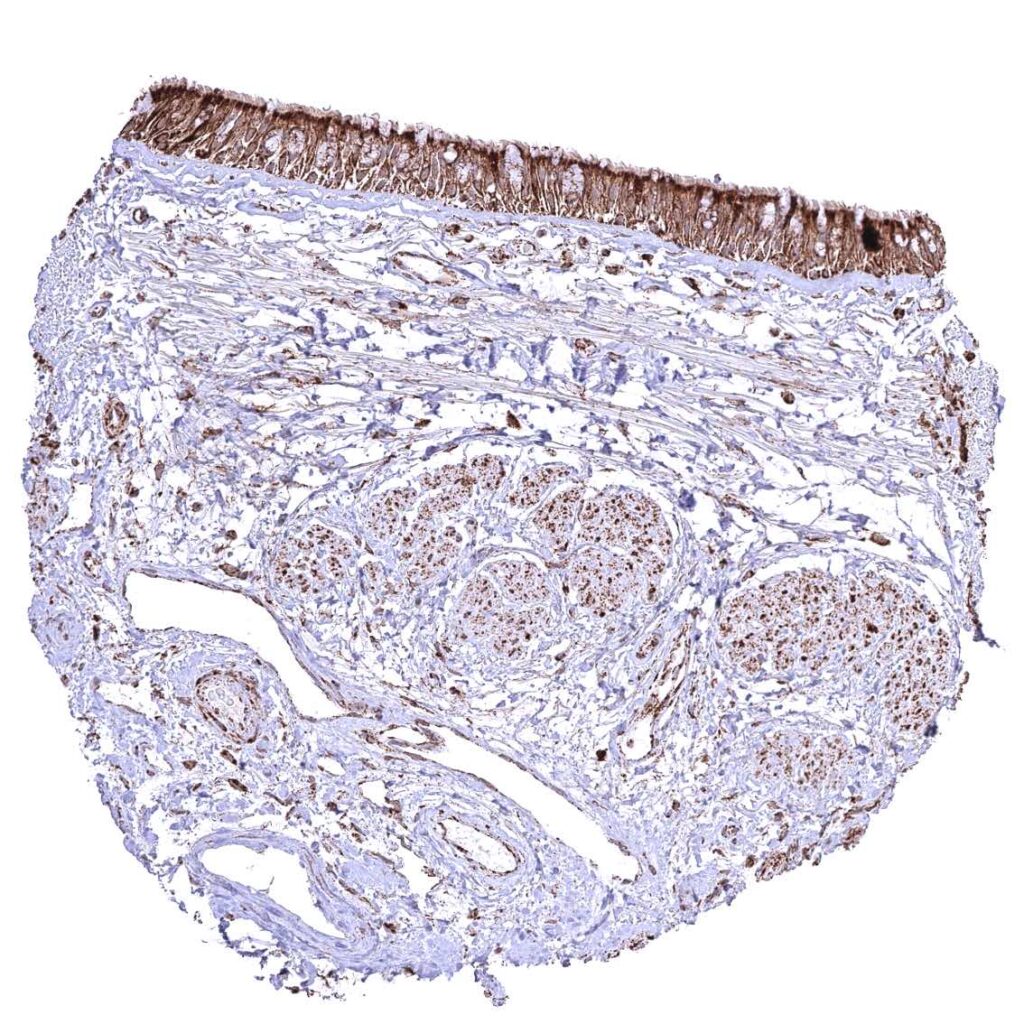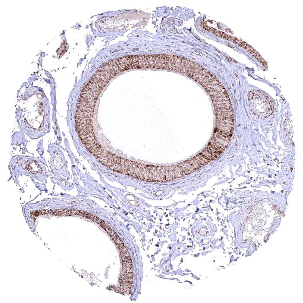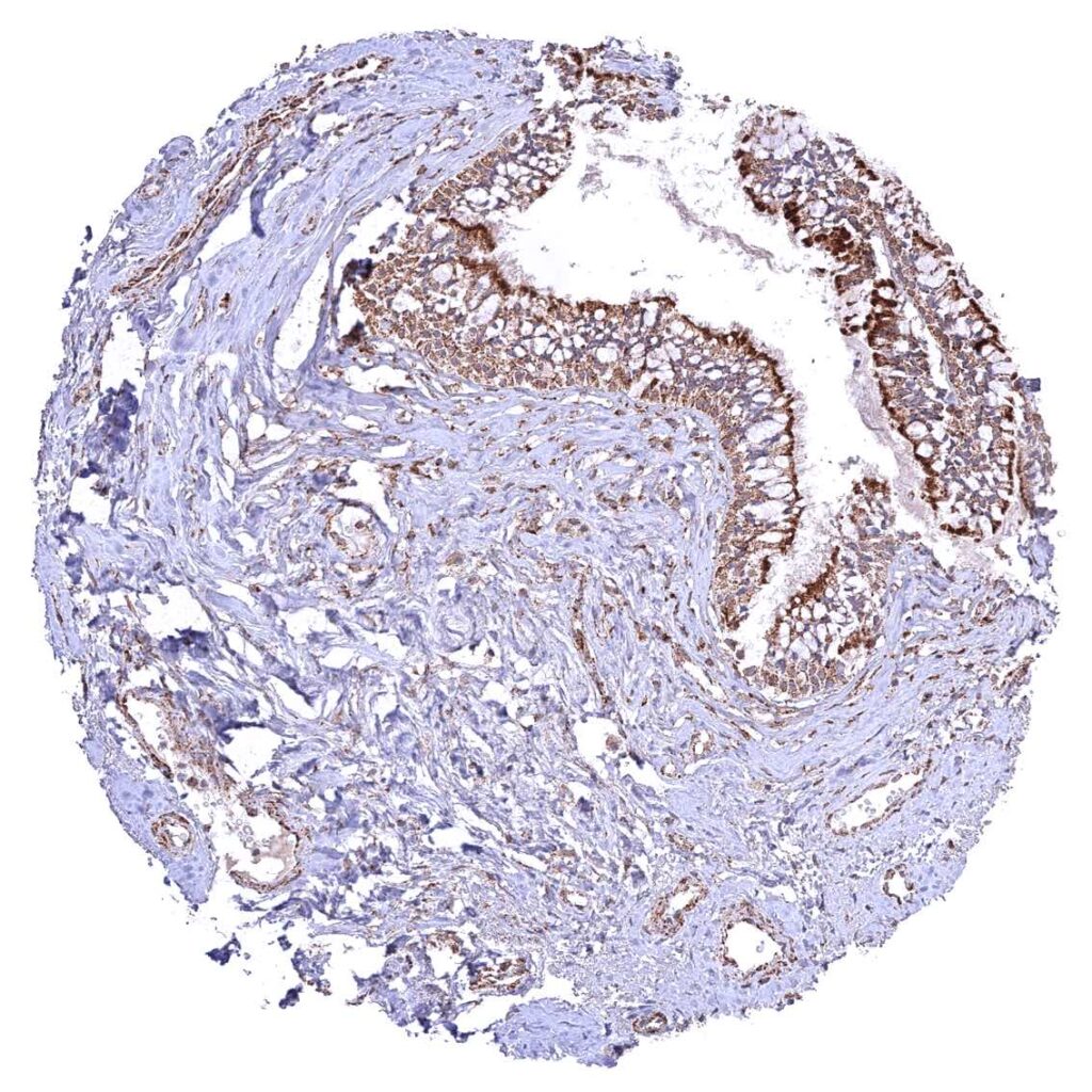 Bronchus, mucosa – Cytoplasmic ATP5J staining occurs in all cell types. A characteristic granular cytoplasmic staining is seen below the apical membranes.