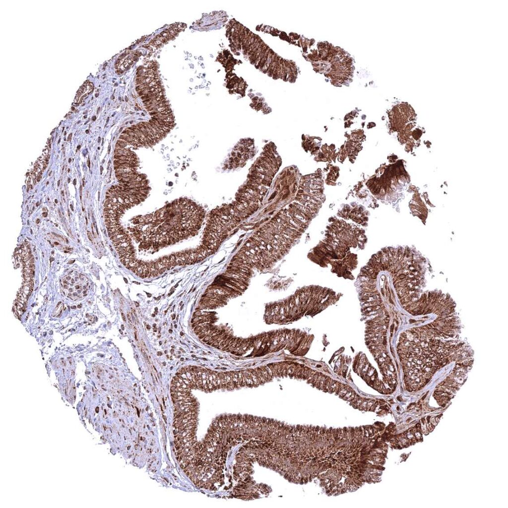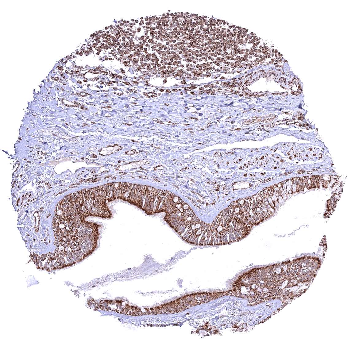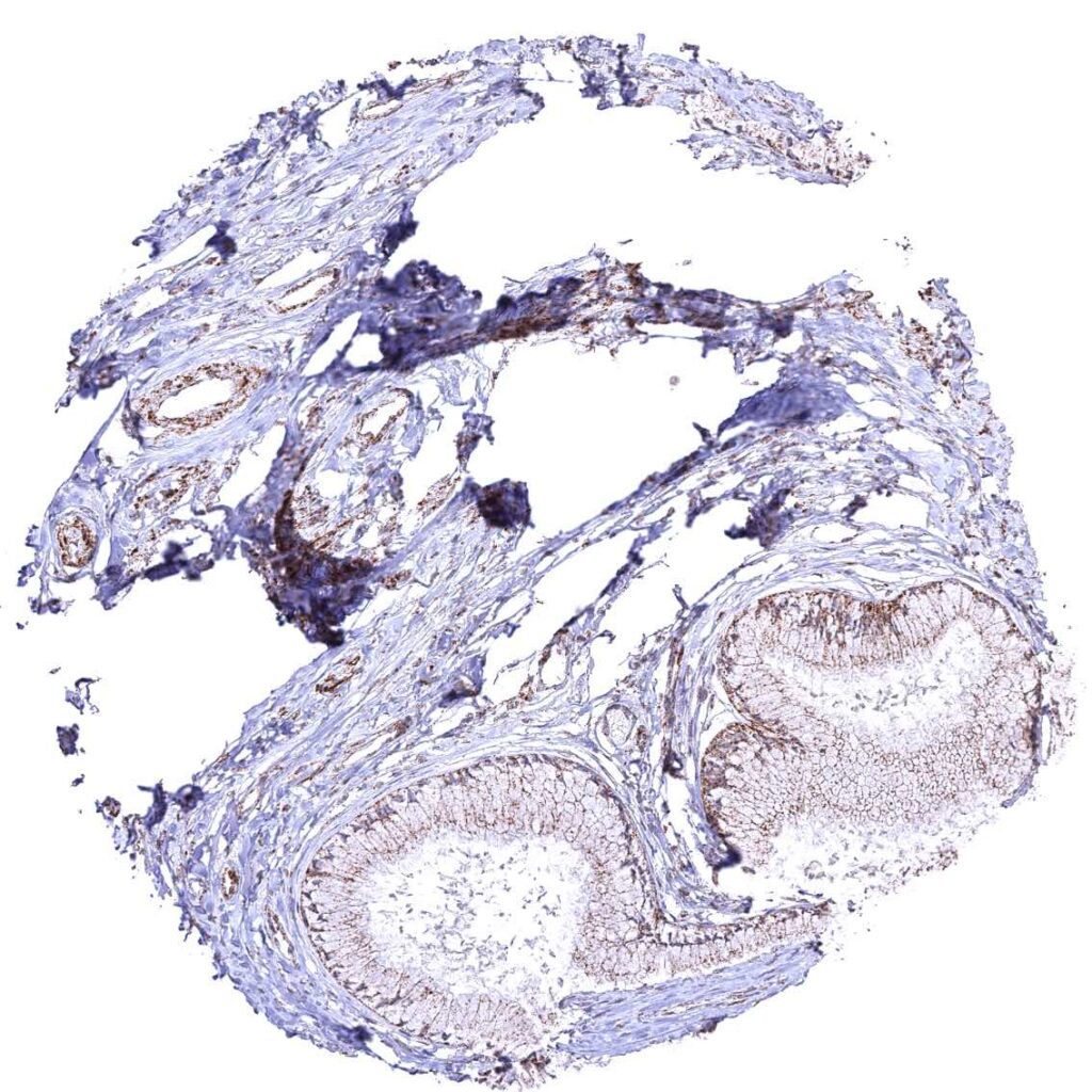 Bronchus, mucosa – Cytoplasmic ATP5J staining occurs in all cell types. A characteristic granular cytoplasmic staining is seen below the apical membranes.