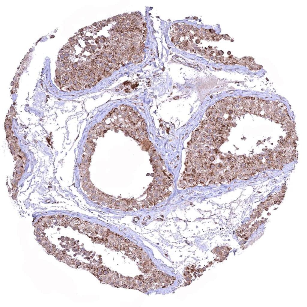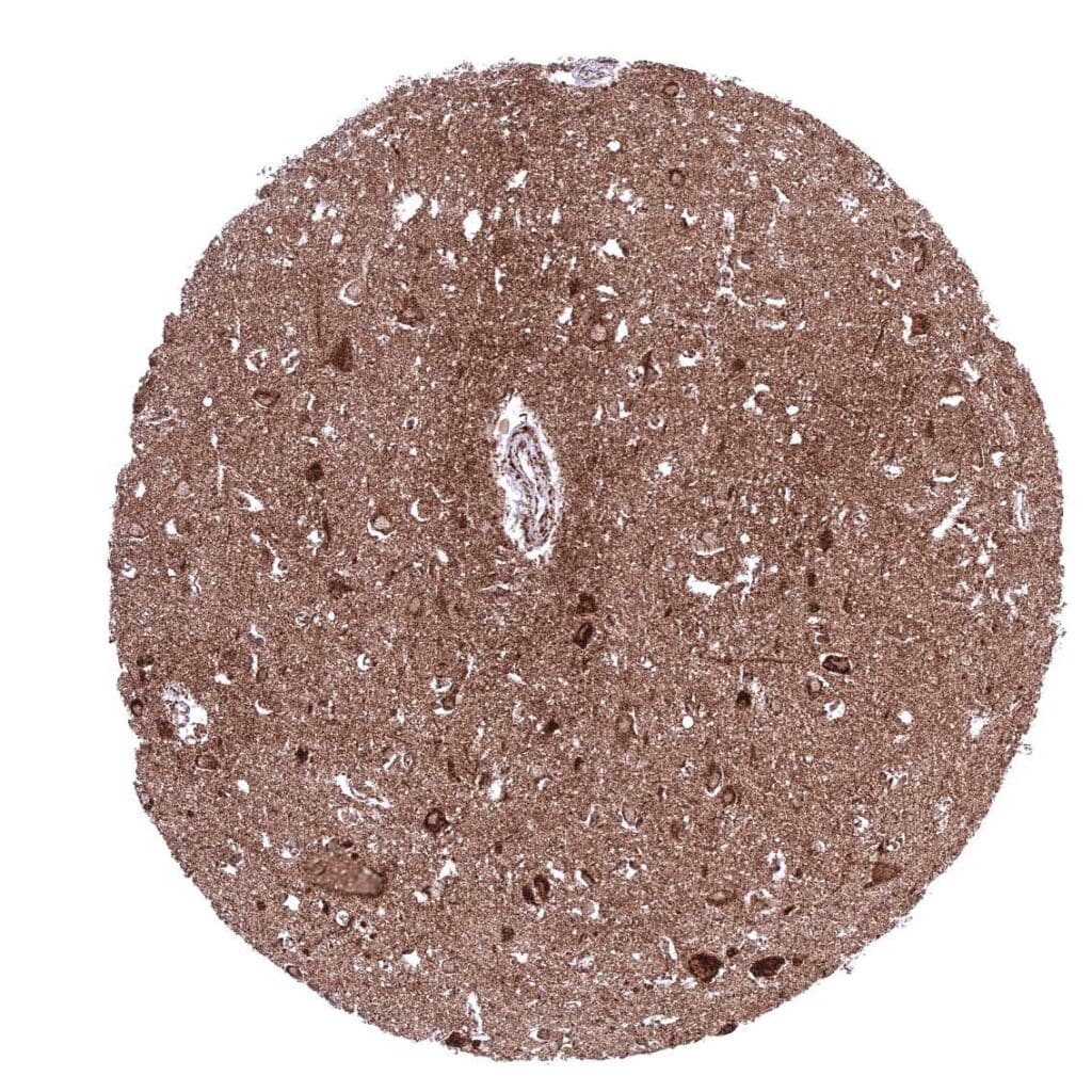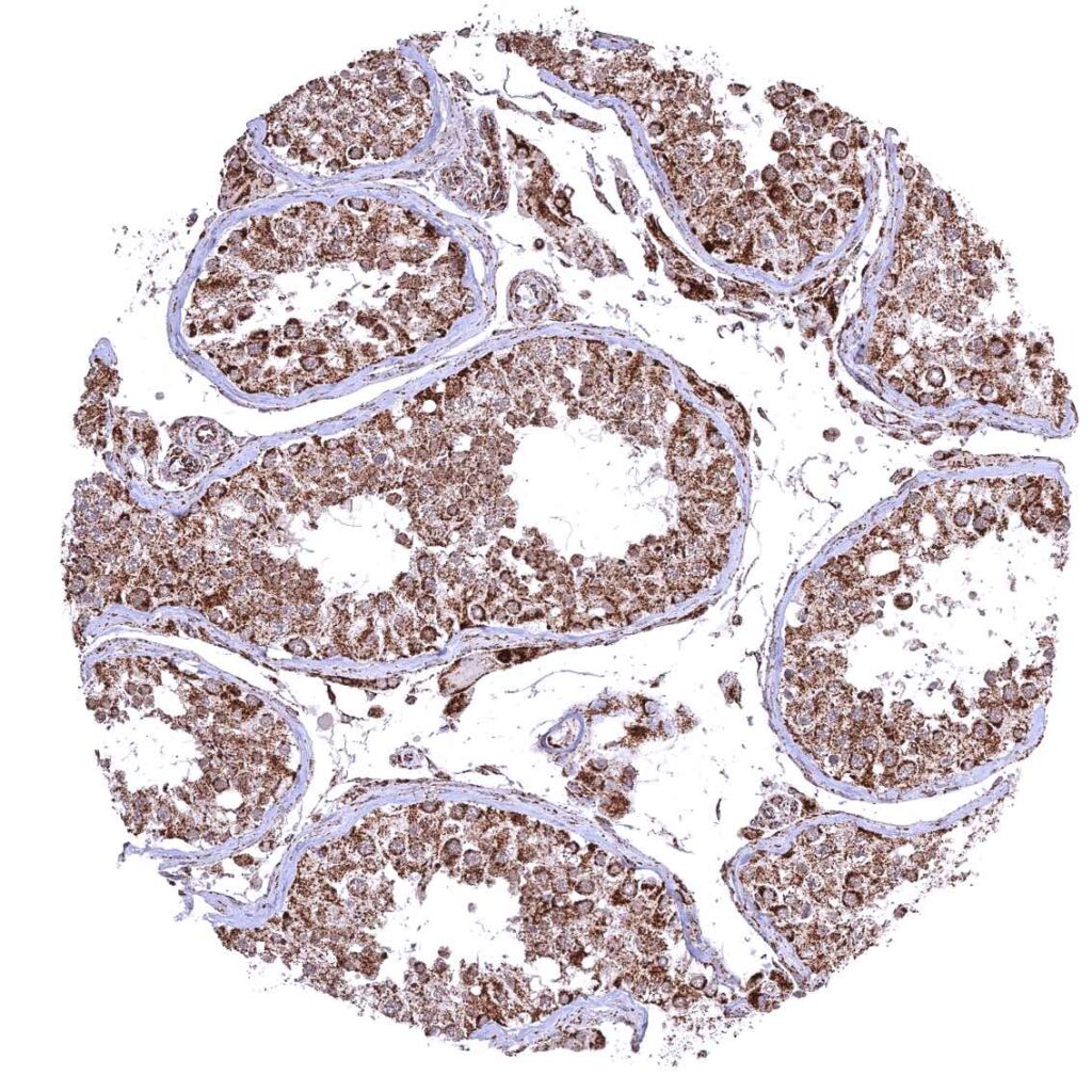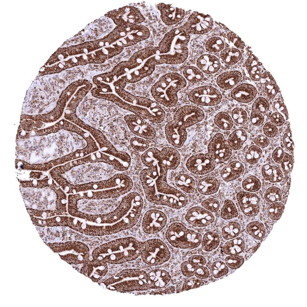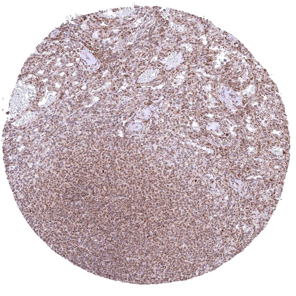 Kidney, cortex – Cytoplasmic ATP5J staining occurs in all cell types. It is intense in all tubuli, moderate in collecting ducts, and least intense in glomeruli.