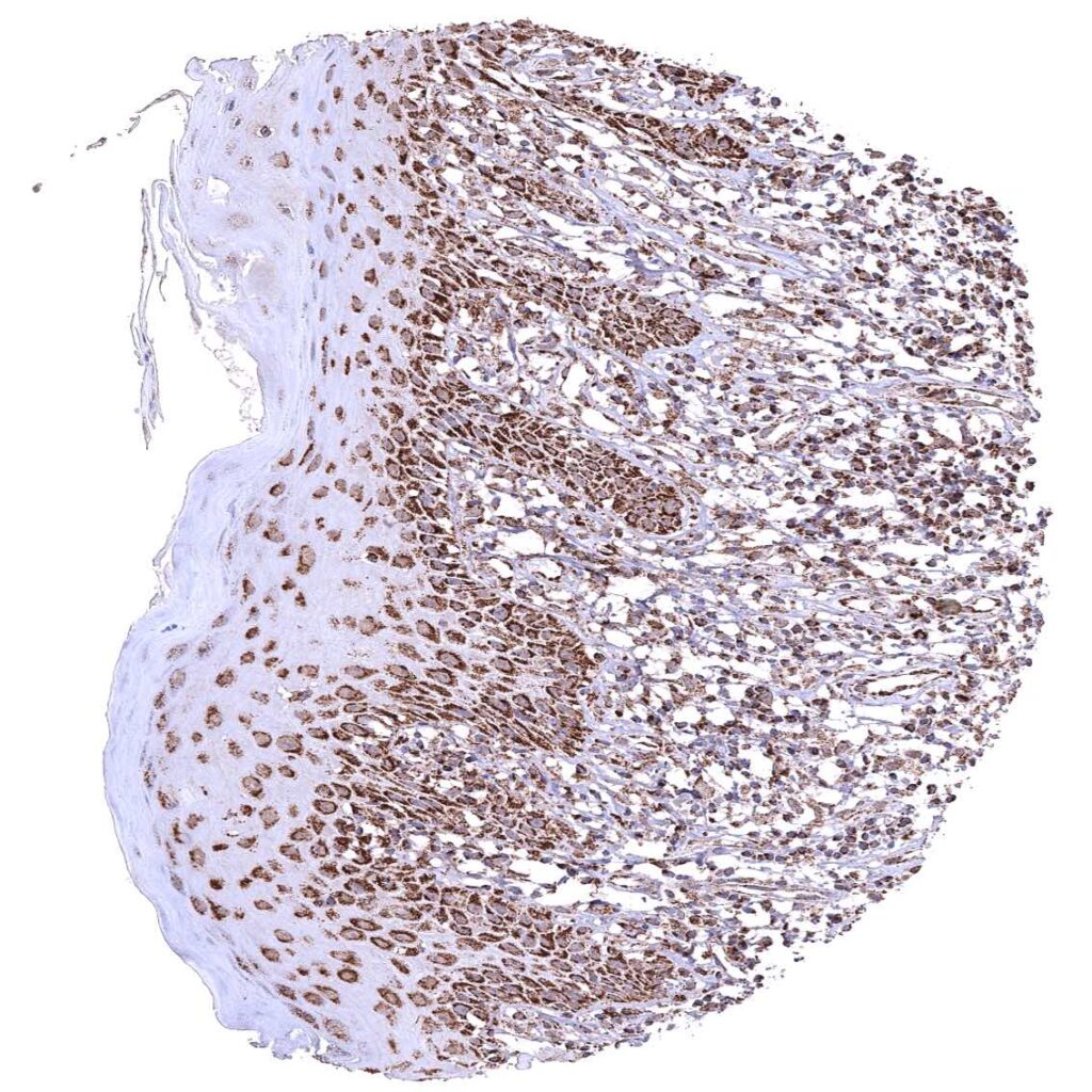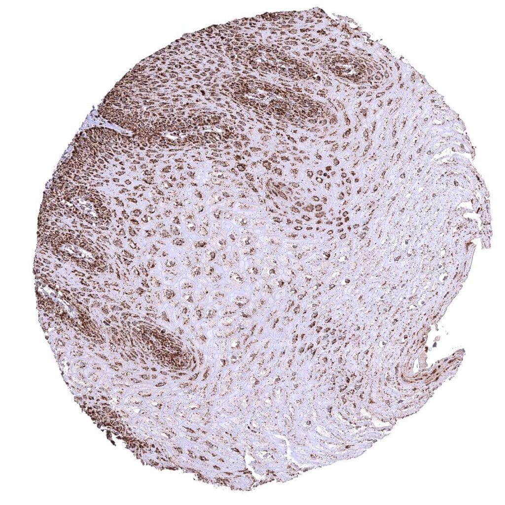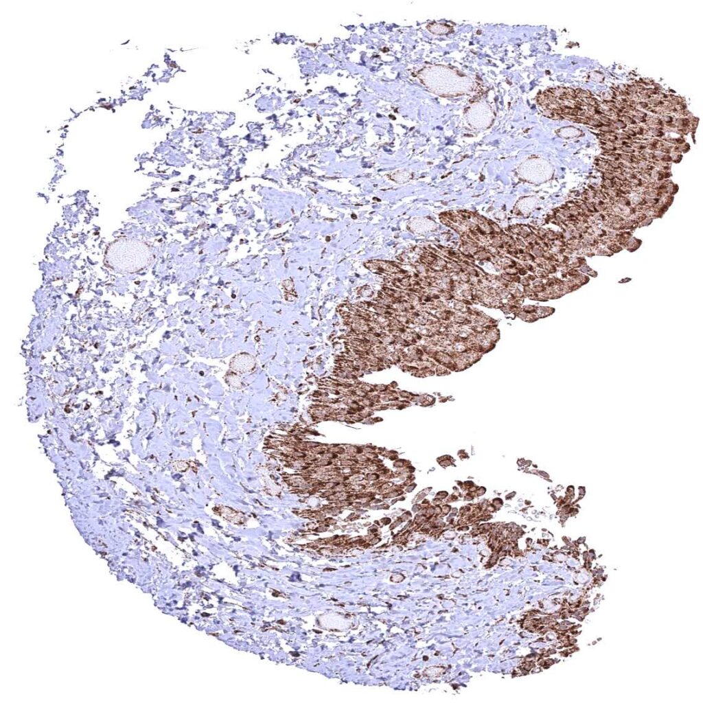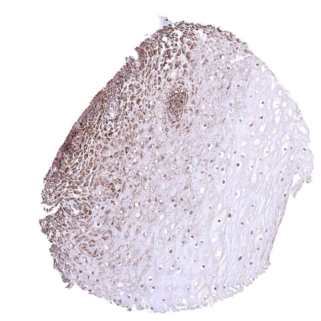 Esophagus, squamous epithelium – Strong granular cytoplasmic ATP5J staining of all cell types. The staining is least intense in superficial cell layers of squamous epithelium.