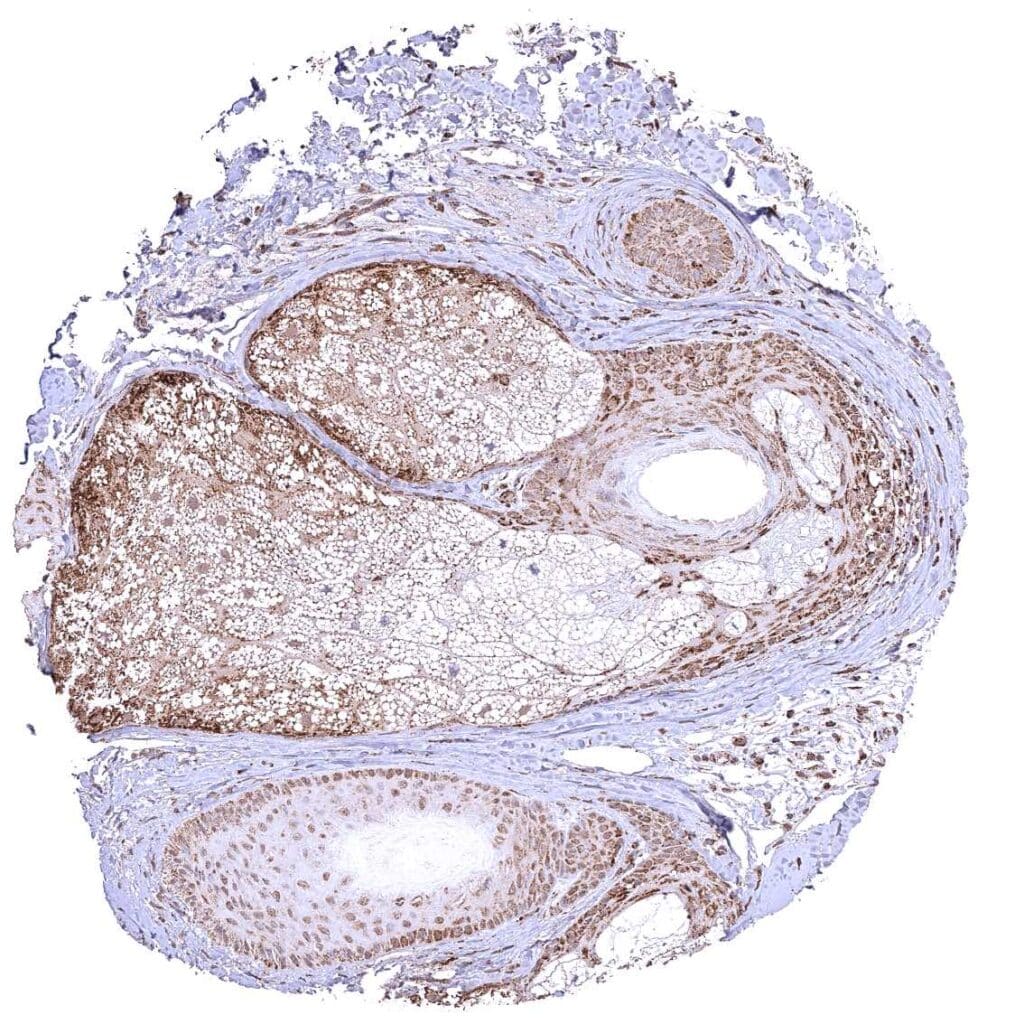 Skin, hairfollicel and sebaceous glands – Distinct cytoplasmic ATP5J staining of all cell types of hair follicles but staining is particularly weak in sebaceous glandular cells.