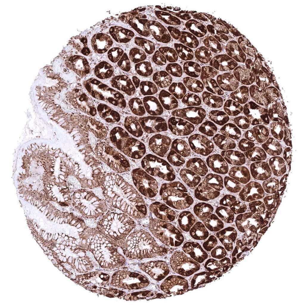 Stomach, corpus – Cytoplasmic ATP5J staining occurs in all cell types. It is most intense in parietal cells and least intense in superficial epithelial cells.