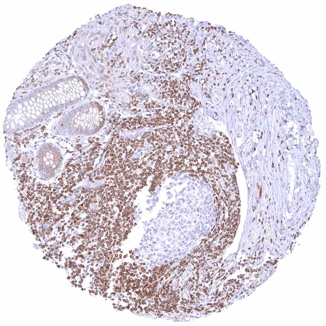 Appendix, mucosa – Cytoplasmic bcl-2 staining is largely limited to (non-germinal centre) lymphocytes. Weak bcl-2 staining of crypt cells.
