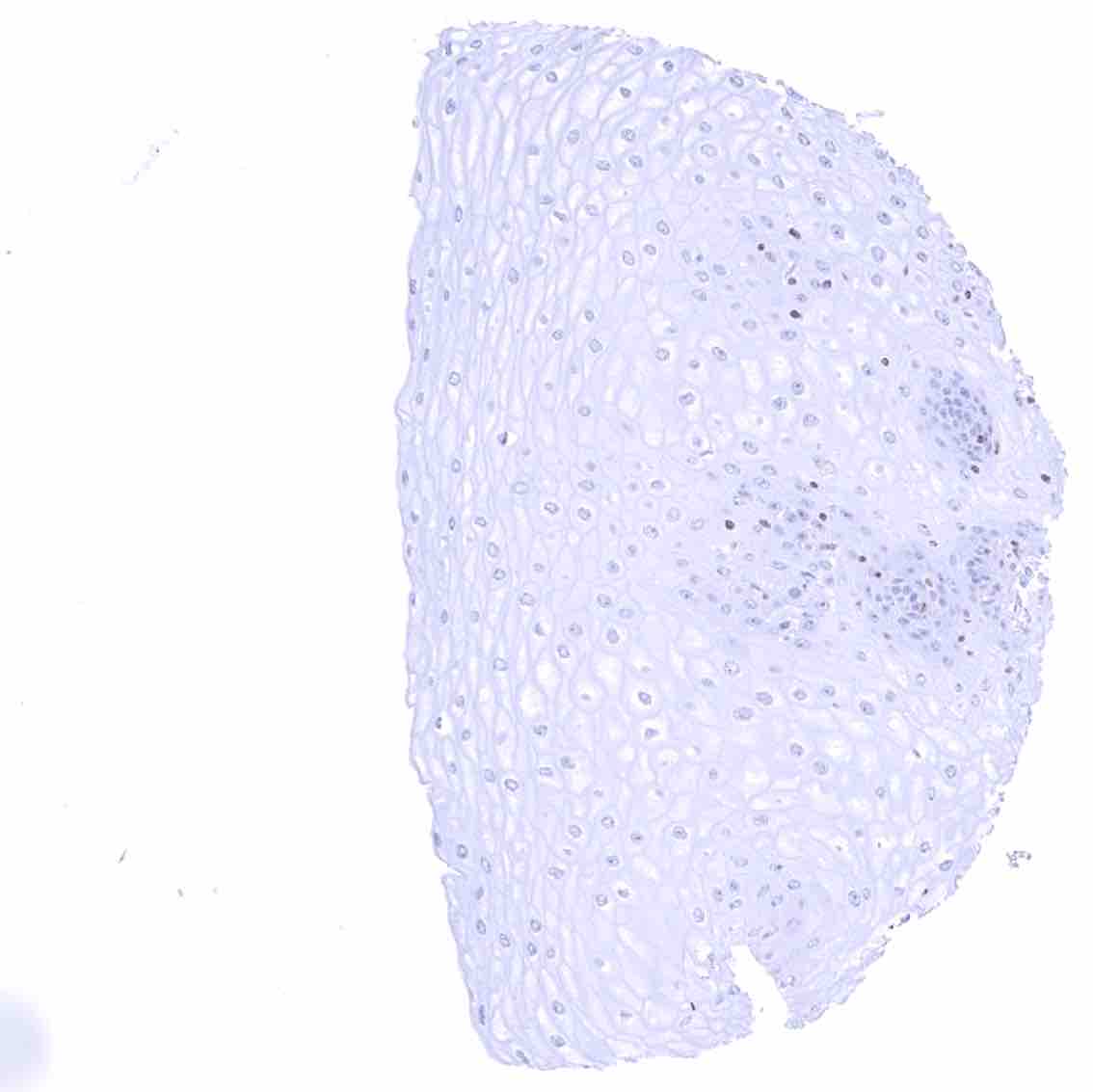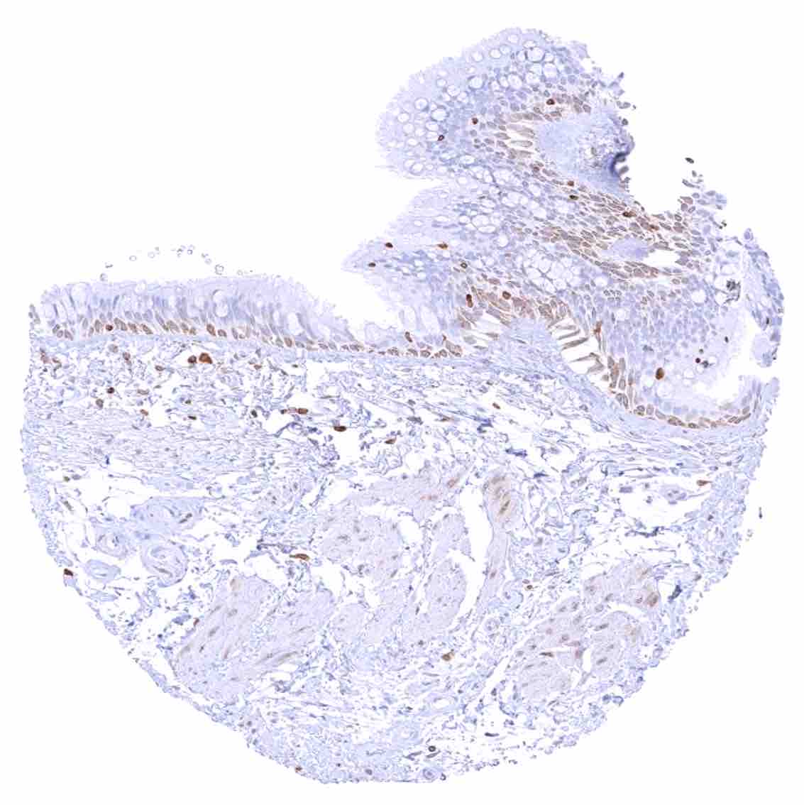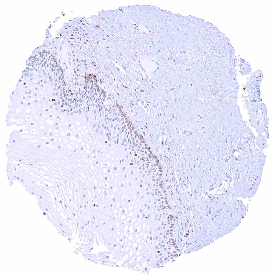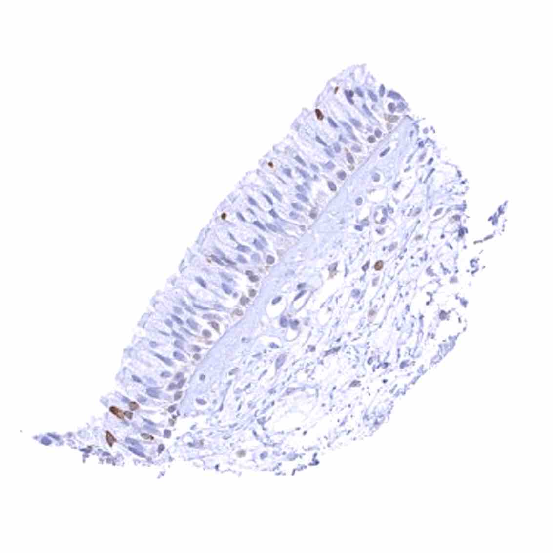 Uterus, ectocervix – Weak cytoplasmic bcl-2 staining of basal cells of the squamous epithelium.