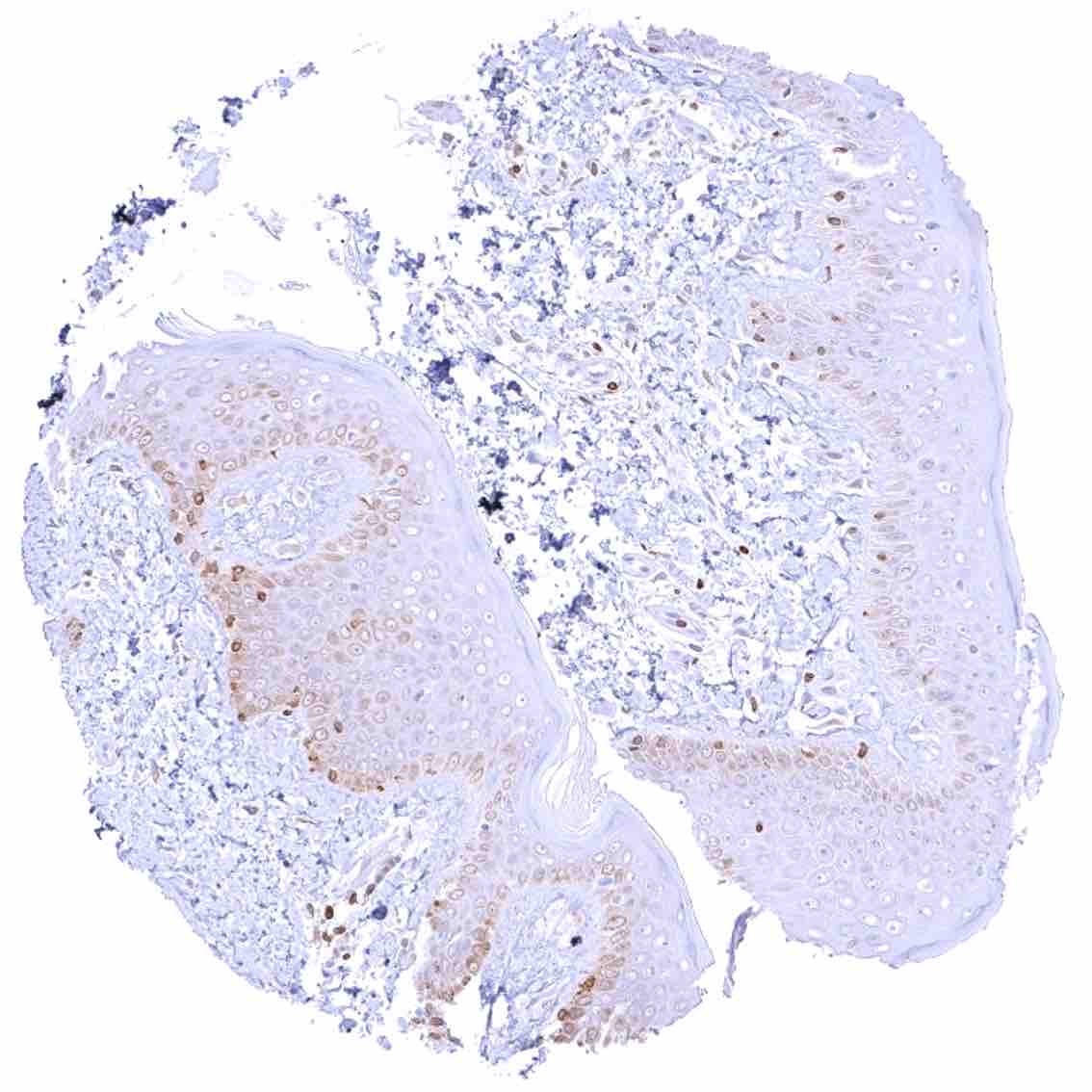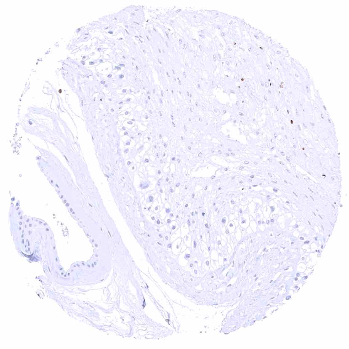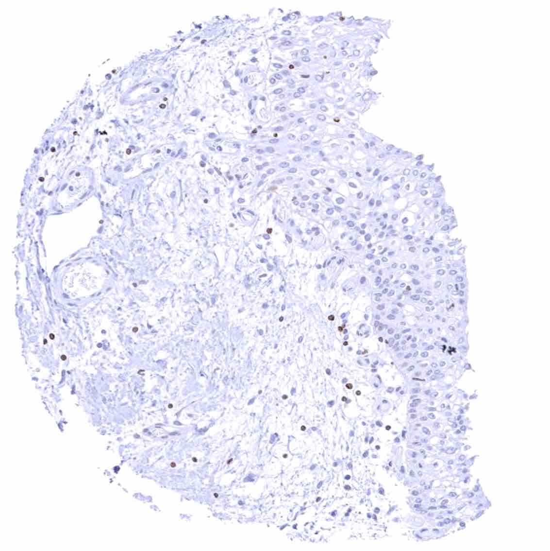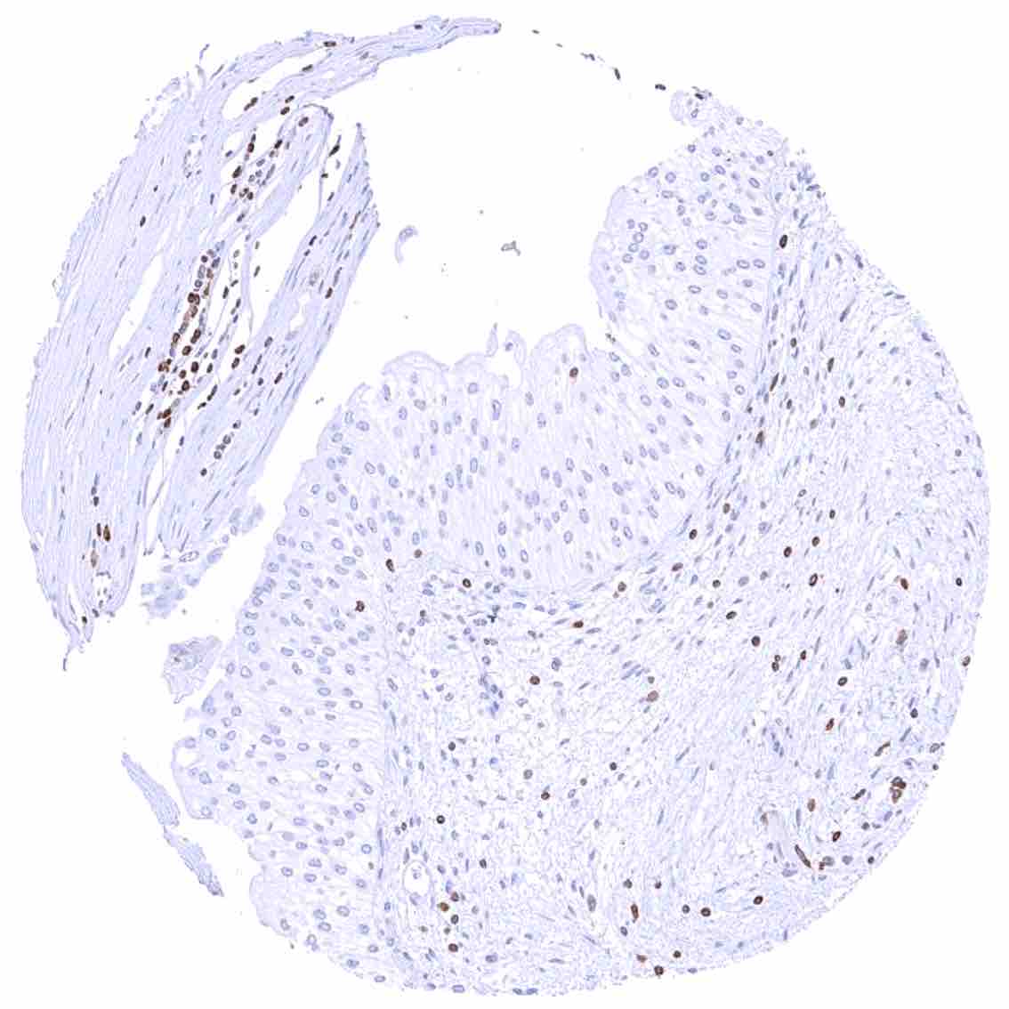 Uterus, ectocervix – Weak cytoplasmic bcl-2 staining of basal cells of the squamous epithelium.